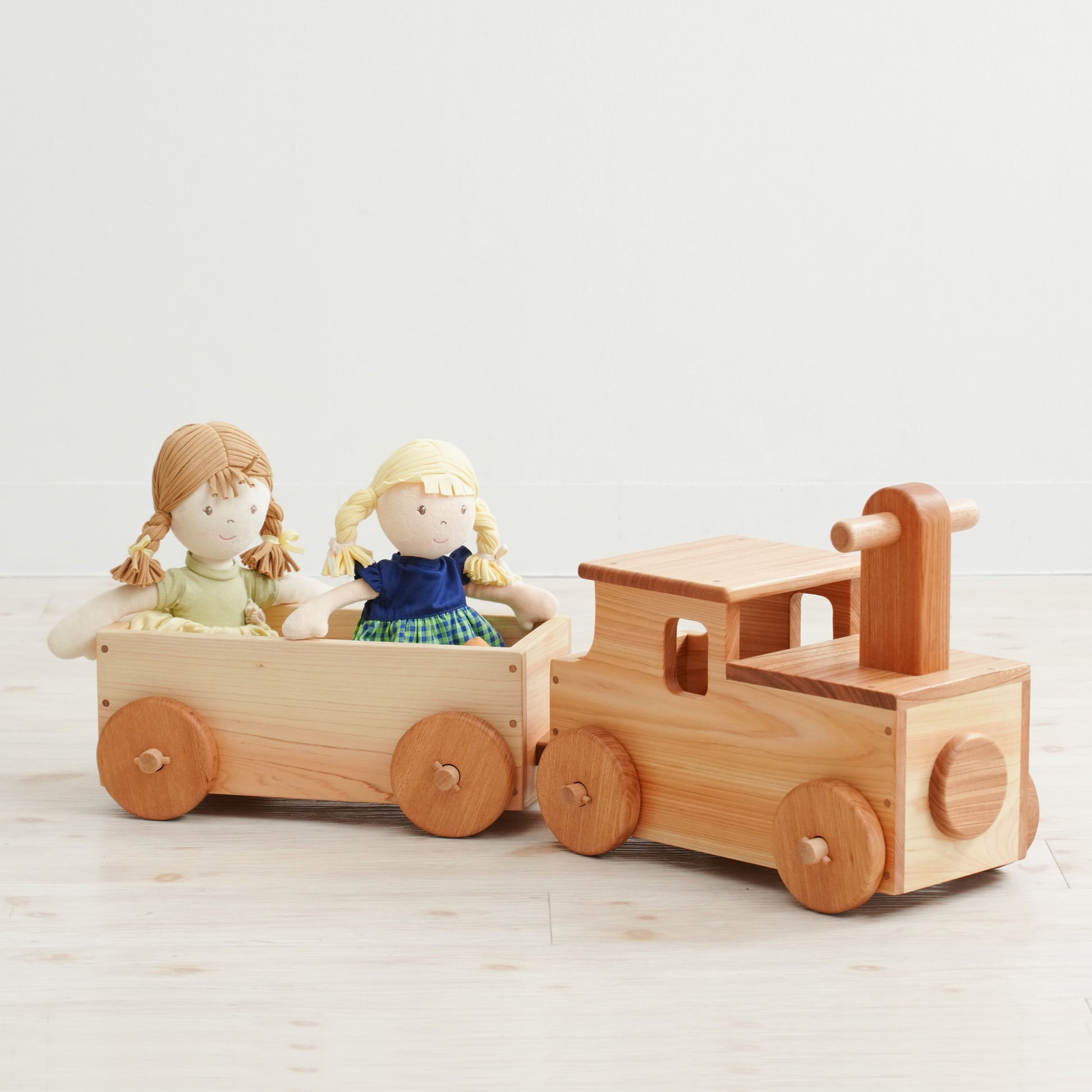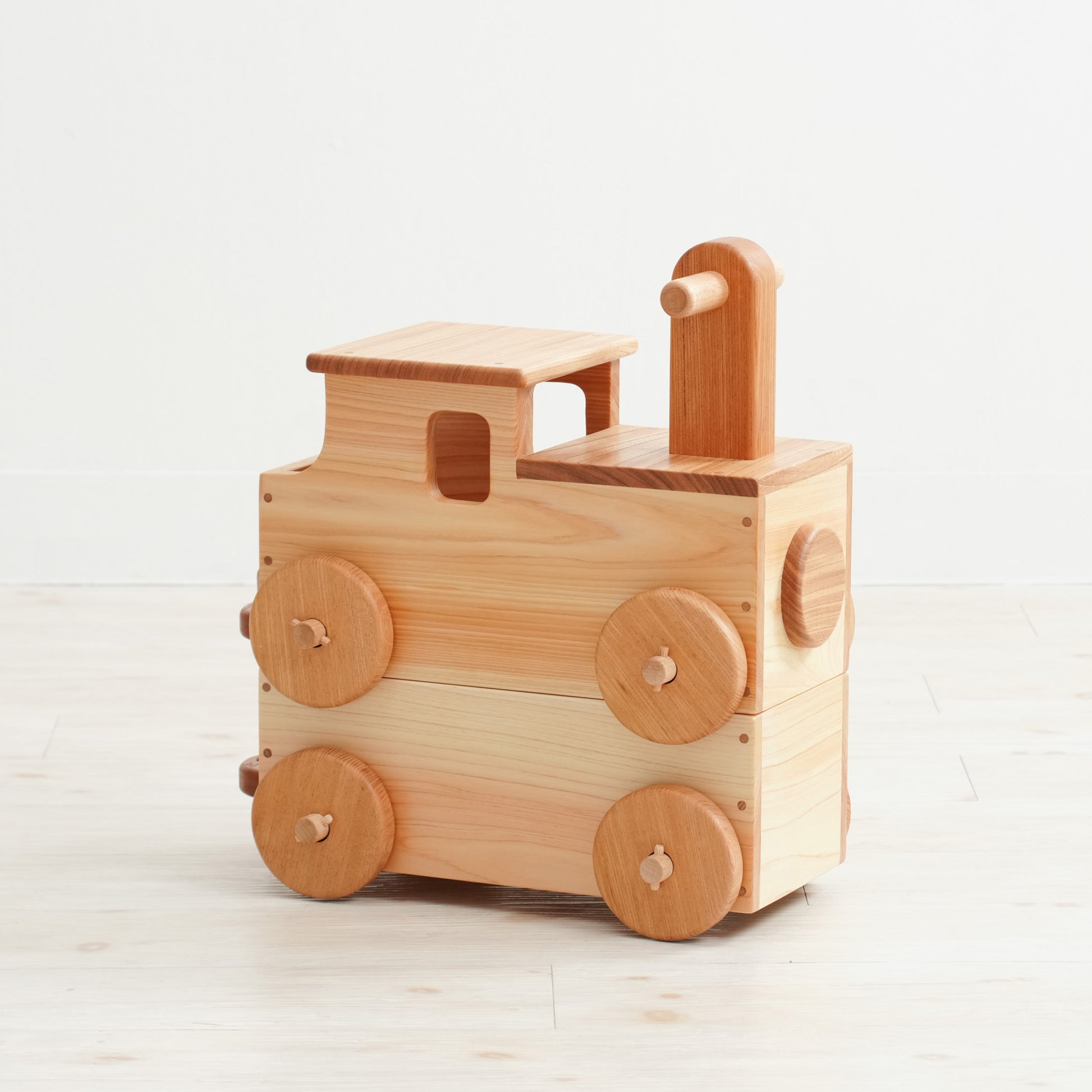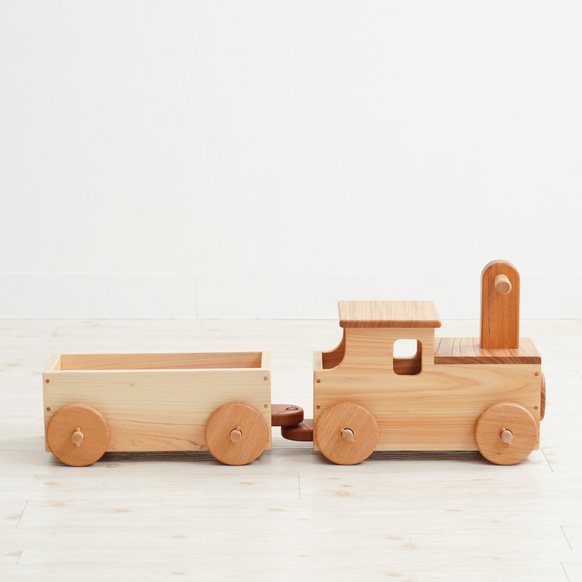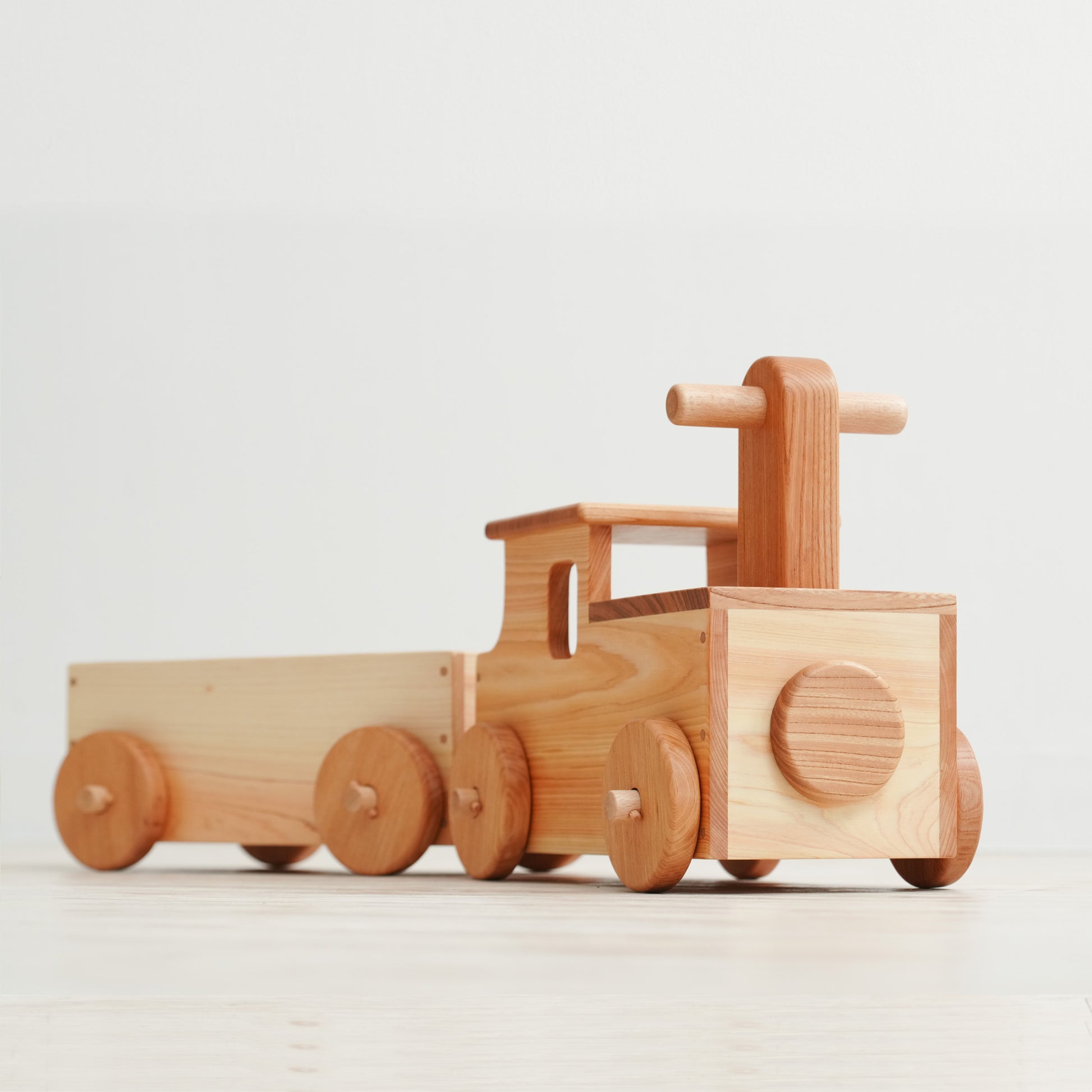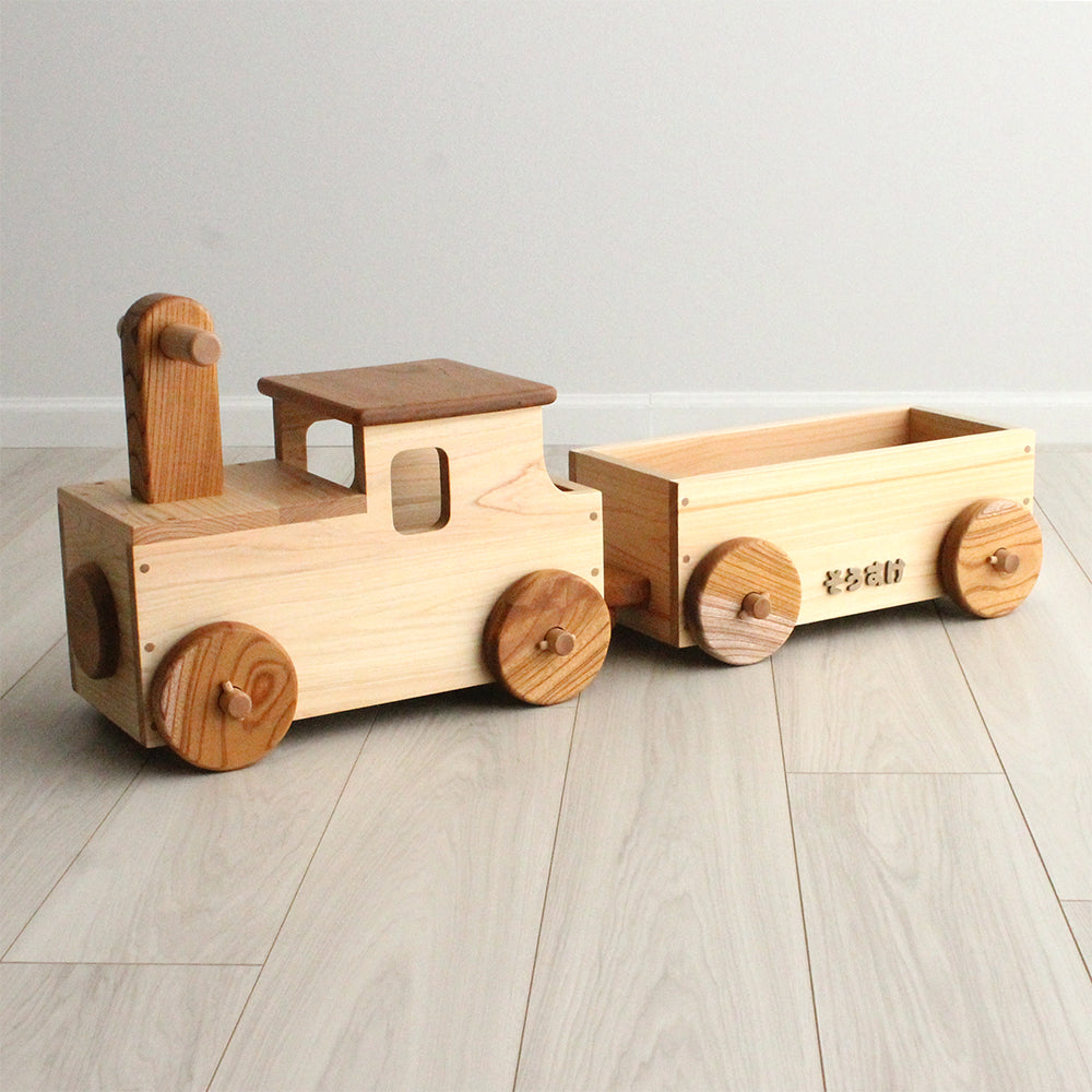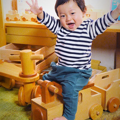 木のおもちゃ専門店なかよしライブラリーが製作する木の連結汽車【機関車マルクト】です。この商品は連結した汽車に子どもが乗って遊べます。自分の足で蹴って前に進みます。運動神経を鍛え、子どもの発達を育みます。お誕生日プレゼント(贈答用)に喜ばれています。国産材使用、植物油で口に入れても安心レベルの高品質な木の子ども用品です。