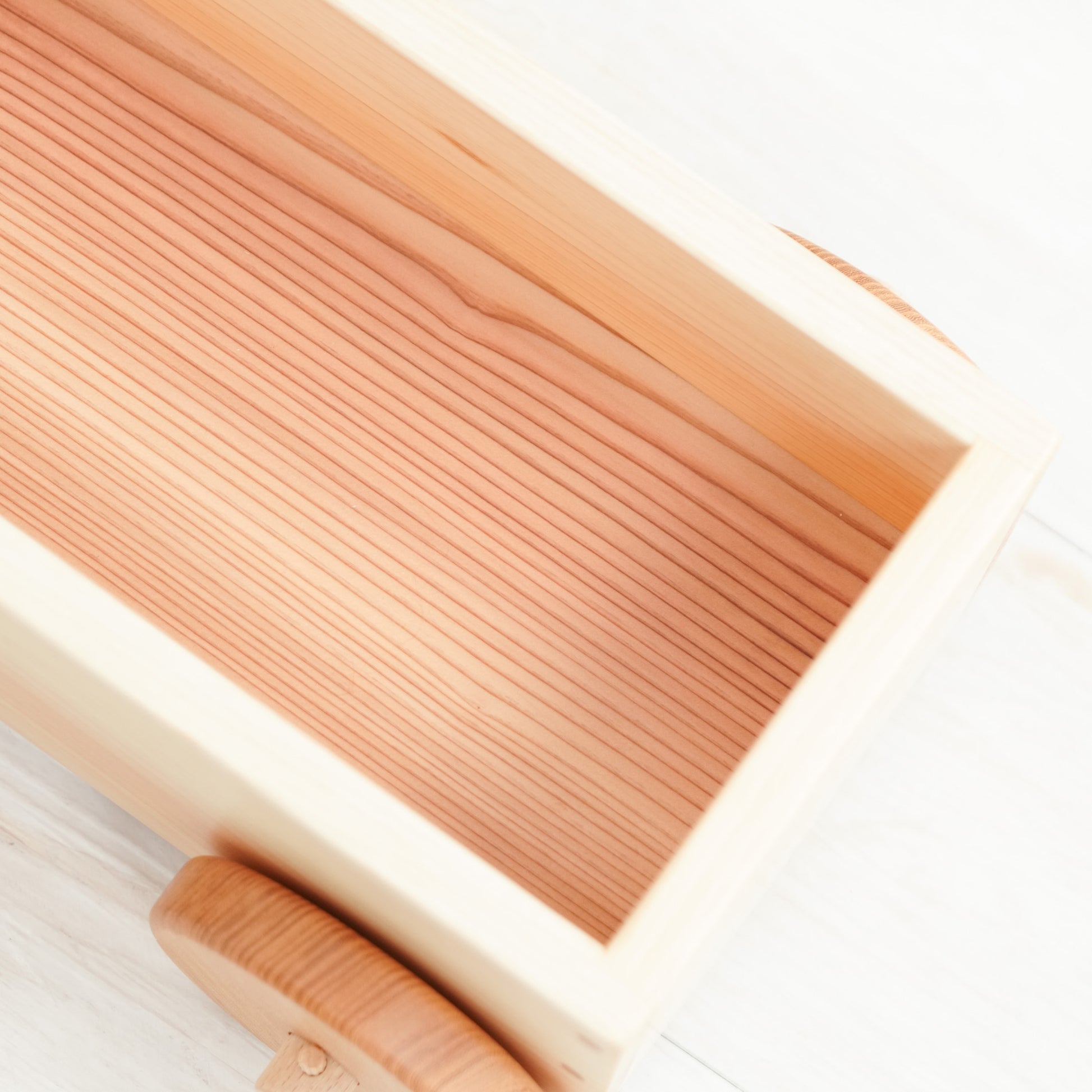 湿気の多い時期には膨らみ、乾燥すると収縮します。木の乾燥は十分に行っているのですが、稀に木のおもちゃの箱に亀裂が入ったり、家具の引出しが少し抜けにくかったりといった動きが見られる場合があります。
