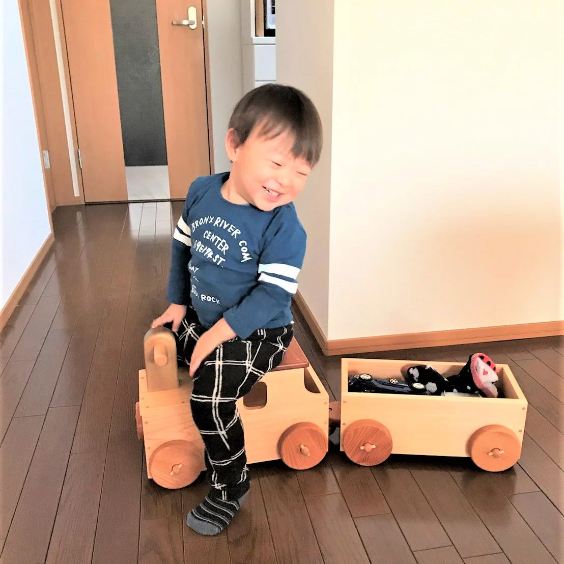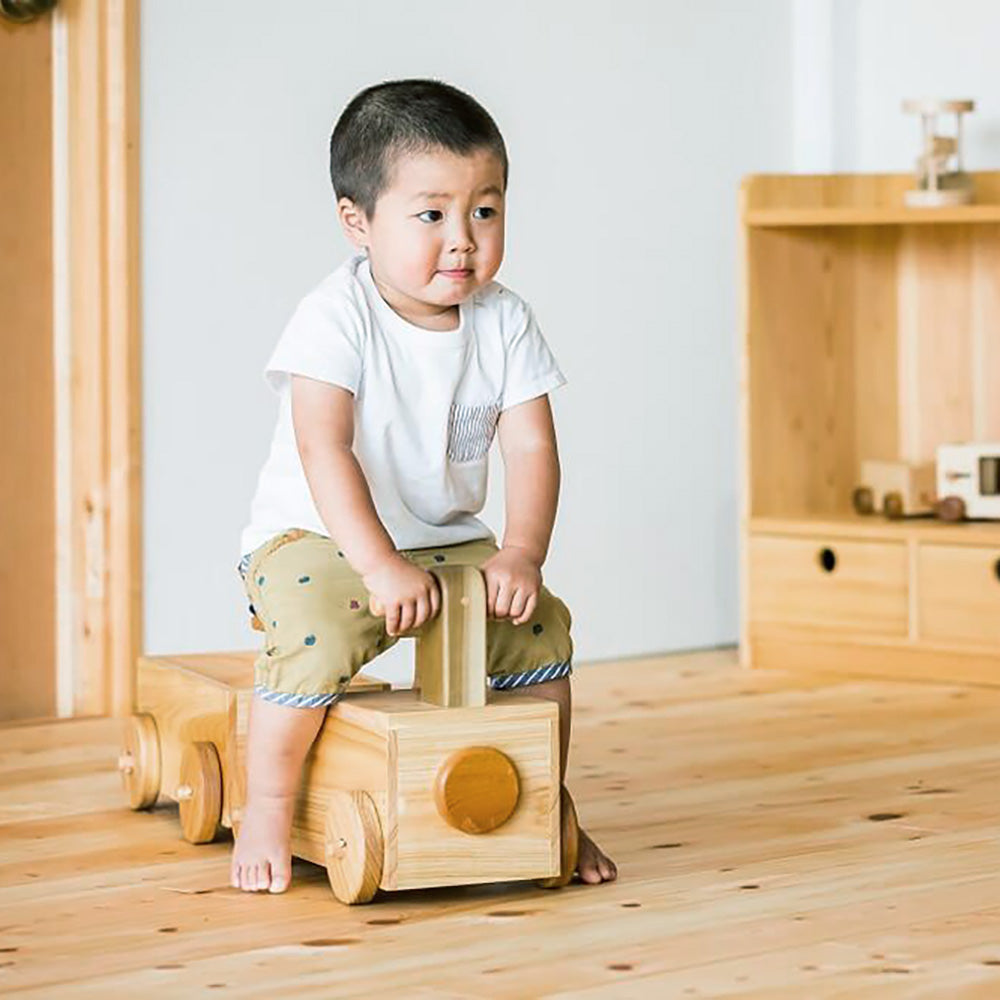 2歳の男の子の誕生日にピッタリの汽車の乗り車です。しっかりと両足を地面に付けて、地面を蹴って進みます。荷台にはお人形やお気に入りのおもちゃを載せてあげてください。家の中が線路になり、駅になり、見立てて遊びがより楽しく、自由に楽しく遊べます。