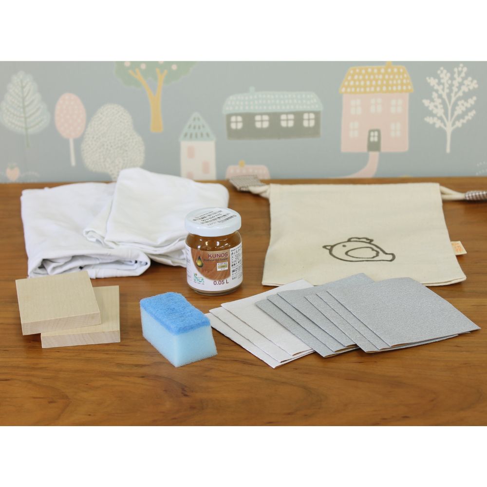 | セット内容 | ・クノスオイル0.05L×1個 ・紙やすり(#240番・#320番) ・雑巾(ウエス)×2枚 ・スポンジ×1個 ・あて木×2個 ※内容は当社の仕入れによって変動します。 |