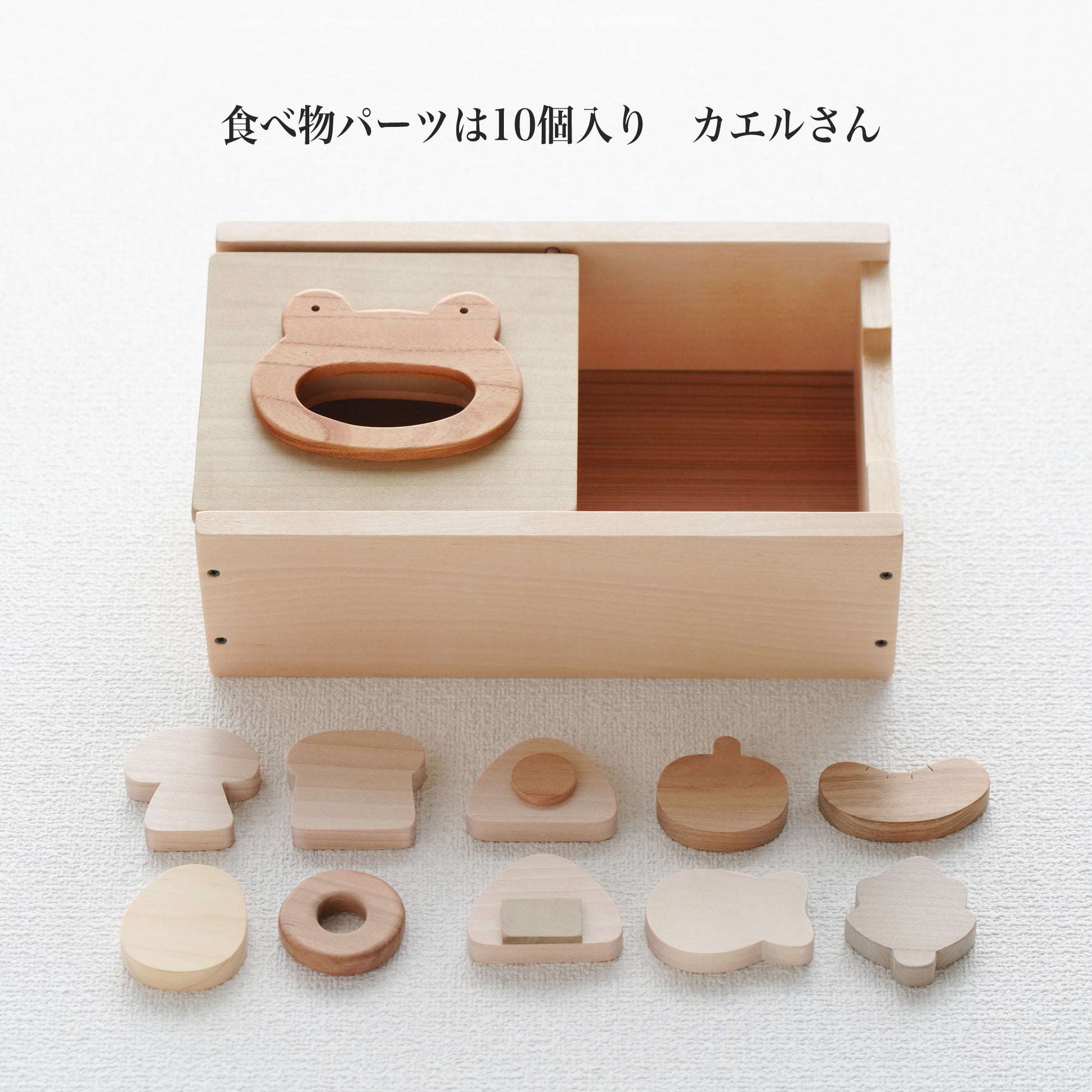 木のおもちゃ専門店なかよしライブラリーが製作する【もぐもぐボックス】です。この商品はかえるさんとくまさんが交互におにぎりやドーナツを食べていきます。お腹いっぱいになったら次はくまさんの番。子どもの1歳のお誕生日プレゼント(贈答用)に喜ばれています。国産材使用、植物油で口に入れても安心レベルの高品質な木のおもちゃです。