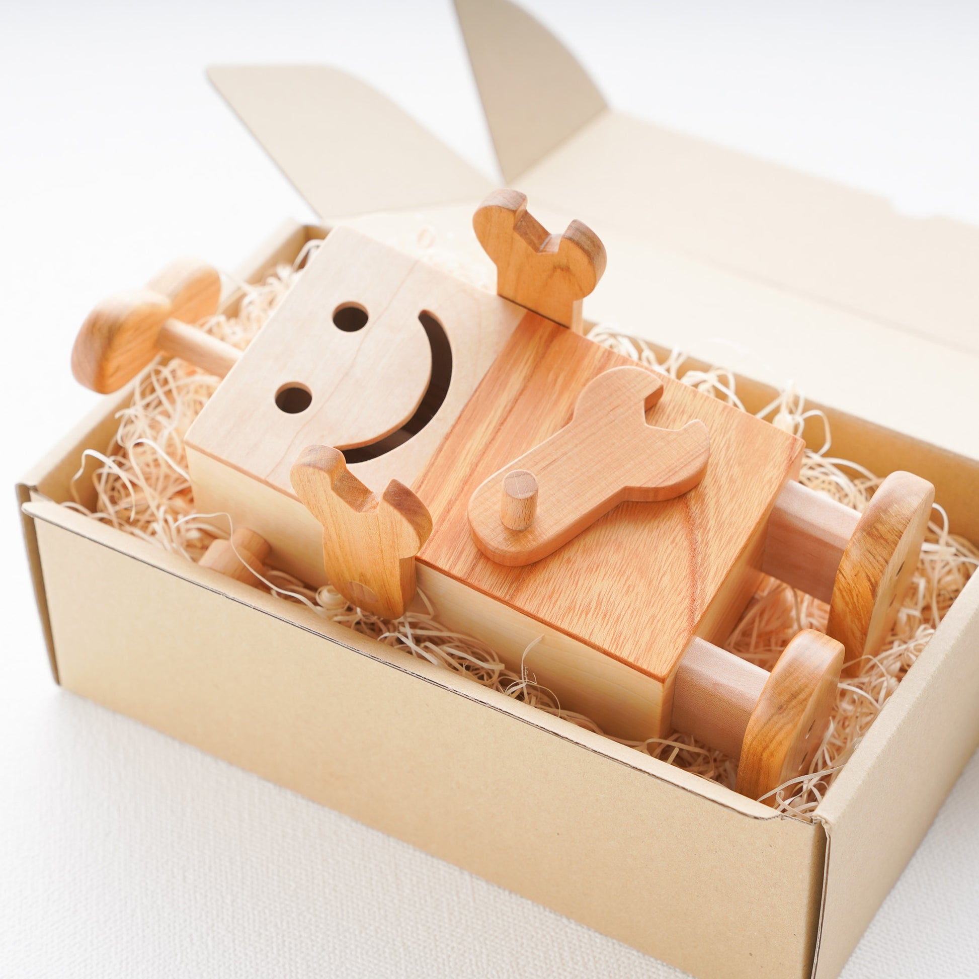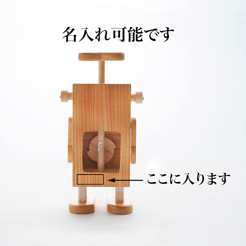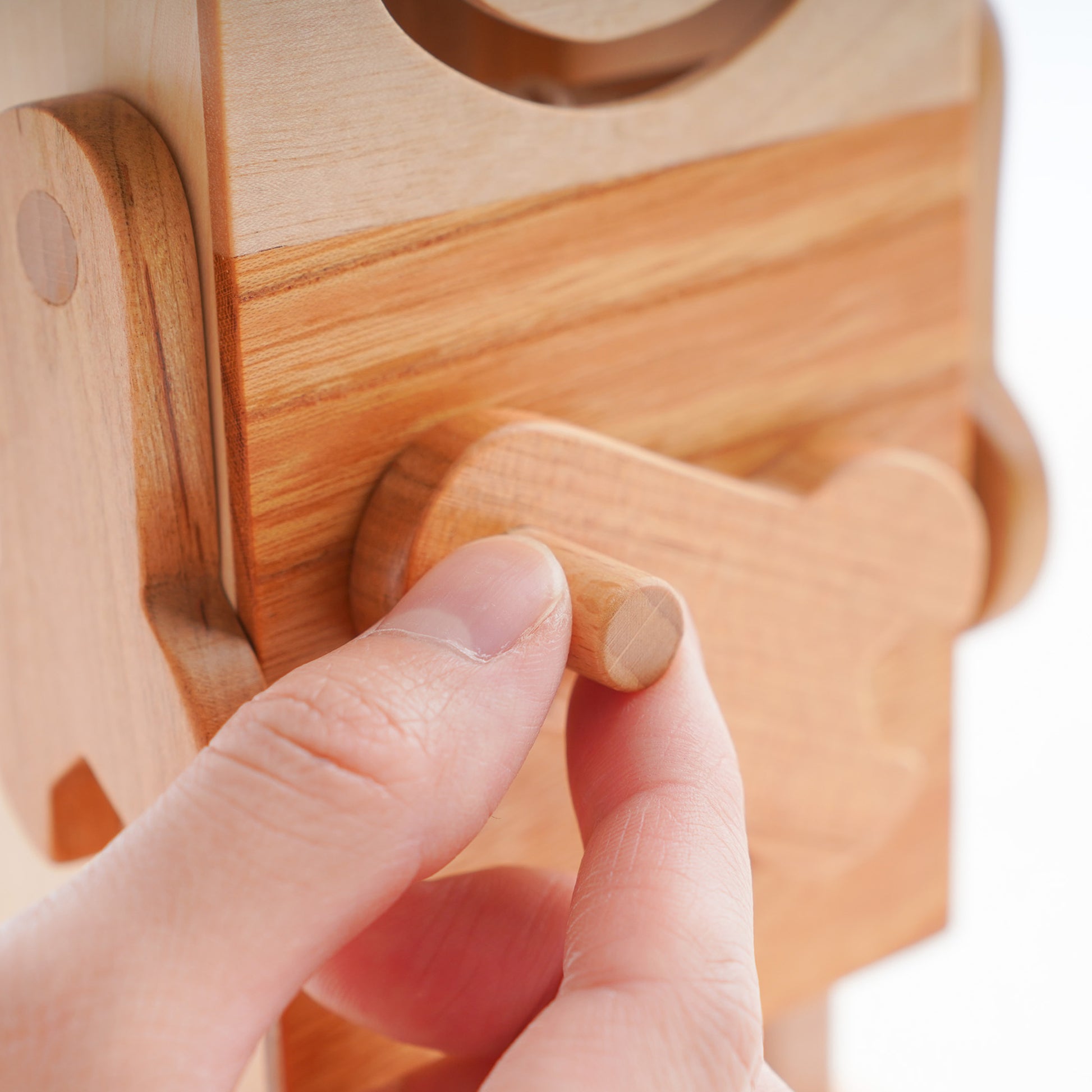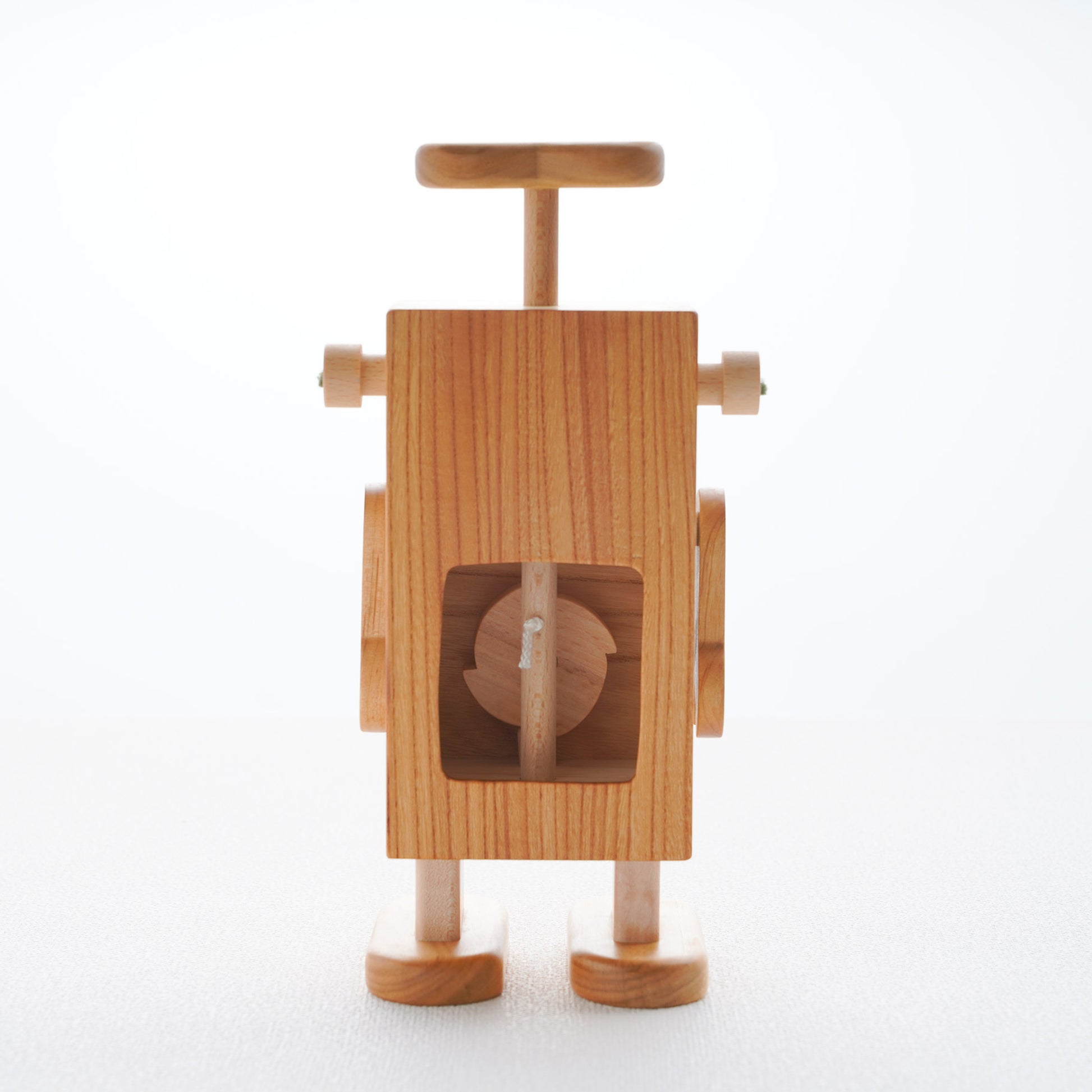 カチカチ回るお腹のスパナ。連れて歩ける可愛い木製ロボット君