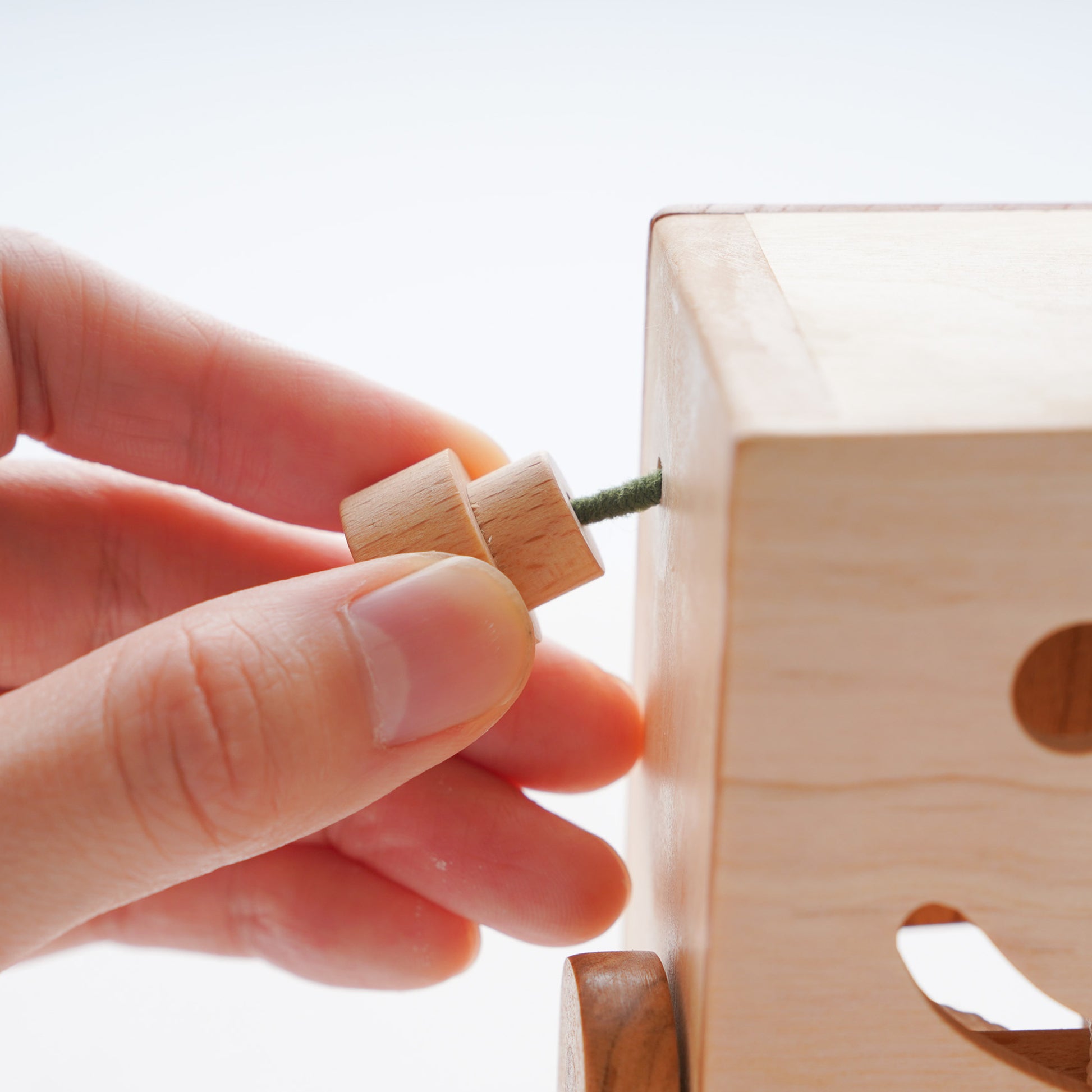 なんでプロペラを回すと手が上がるの?子どもたちがものや体験に対して興味、疑問を持つことはとても大切な気づきの一つです。木と紐の組み合わせでこんなカラクリが出来ます。また、壊れても修理が出来るように長く使えることを考えています。