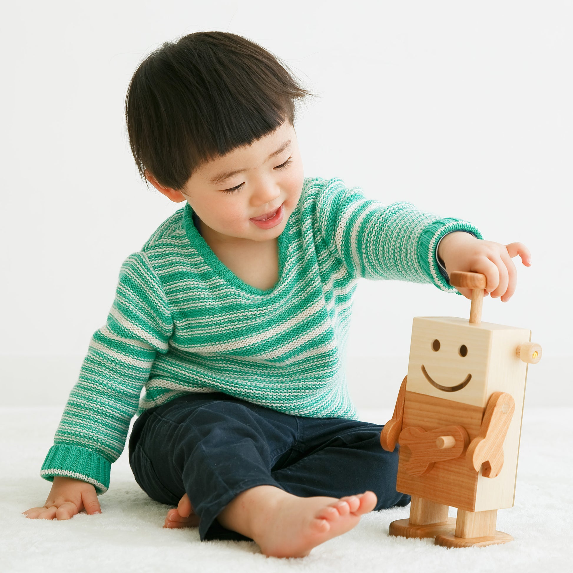 ロボットクンのお友達は子どもたちだけではありません。大人と子どもたちのお友達になれるのです。テレビの主人公ロボットはやはりテレビのイメージで遊ぶことになります。木のロボットクンはお父さん、お母さん、そしてお子様とみんなが友達になれるのですね。私たちは子どもたちの友達を作ることが仕事と考えています。いつもそばに置いて、一緒に生活していくことがおもちゃの役割と考えます。遊んでしまえば捨てられるおもちゃにはなりたくないですね。