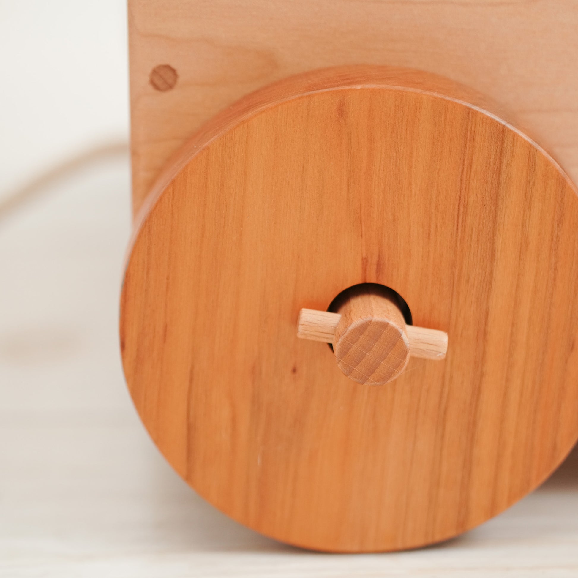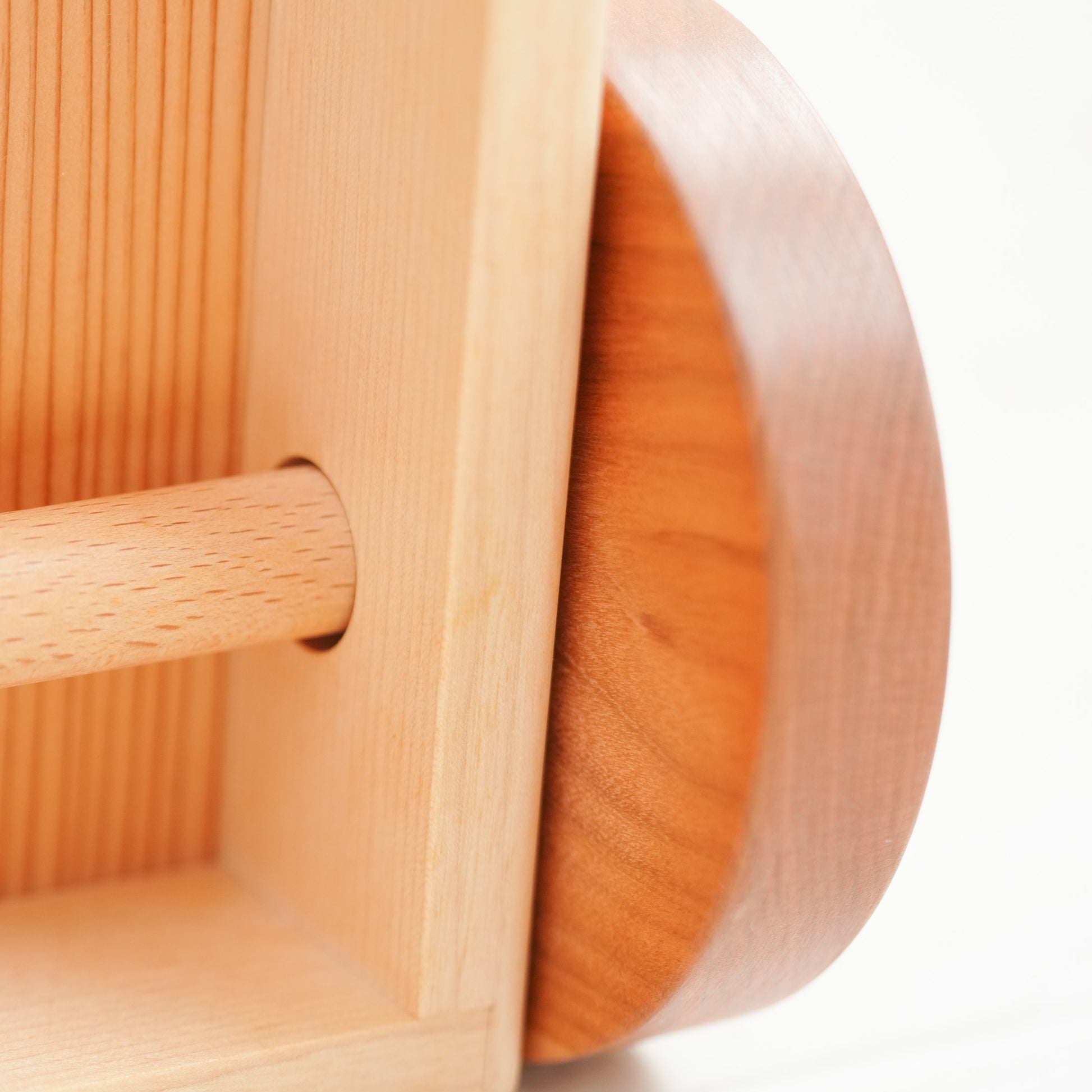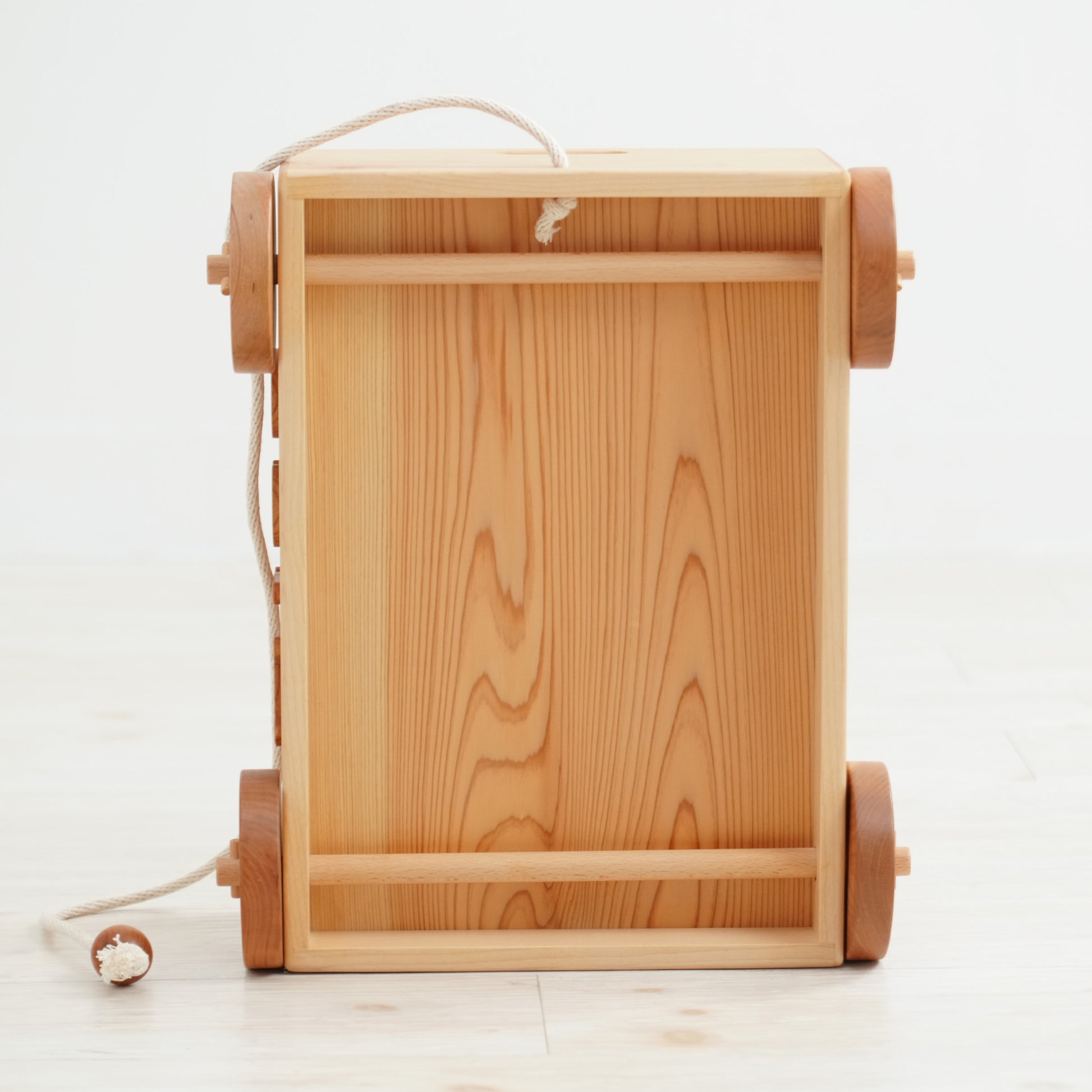 タイヤはケヤキや桜の木、シャフトはブナの木、底板には杉を使用します。金具を使わず、適材を使用しています。遊んだ時に「ゴロゴロ」という木のタイヤの音がとても心地よく聞こえます。