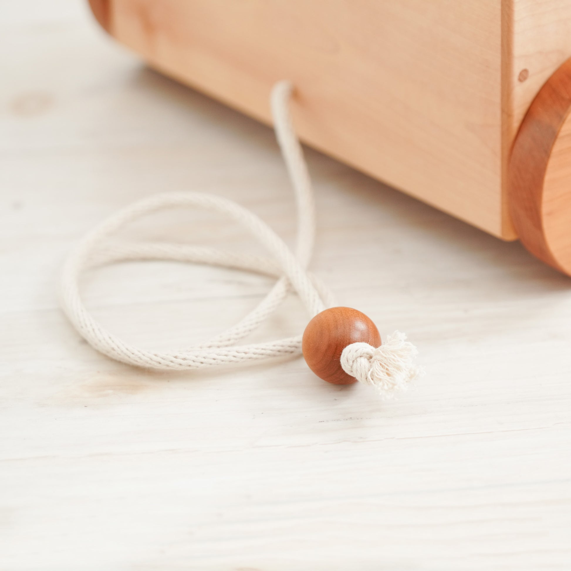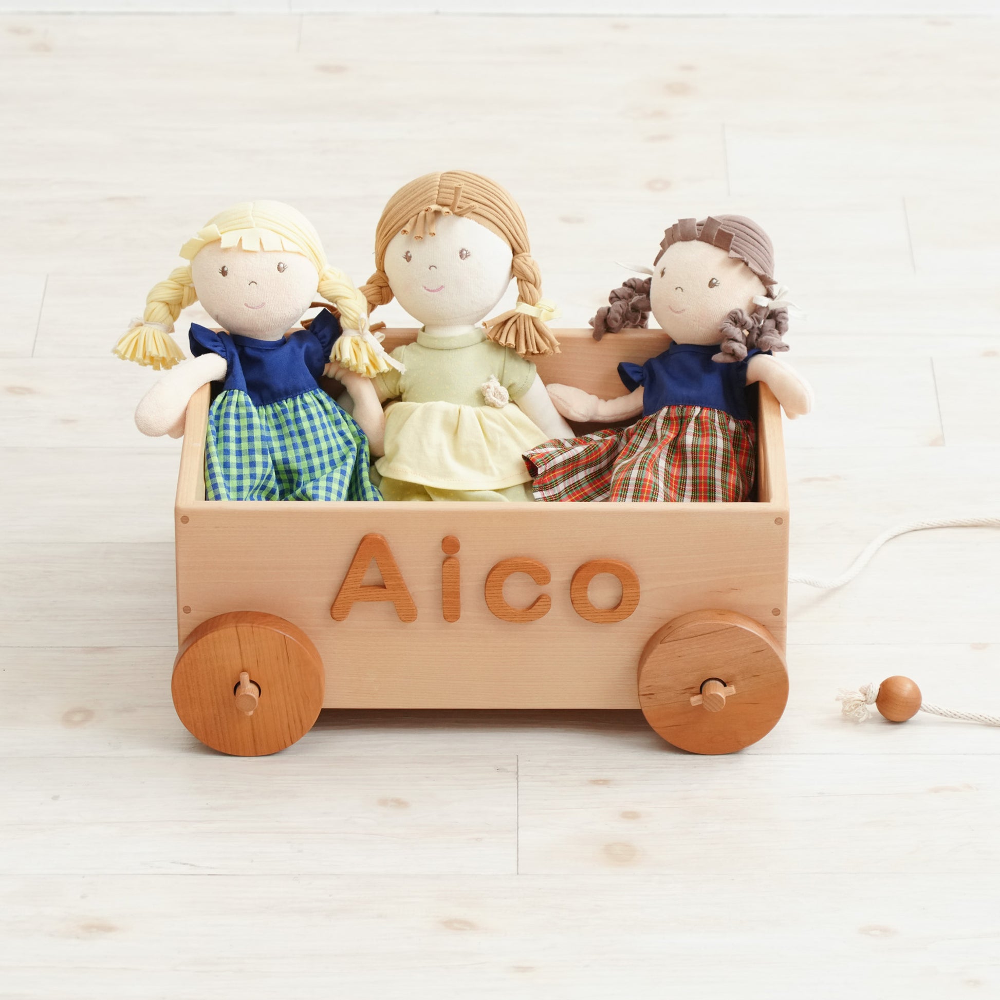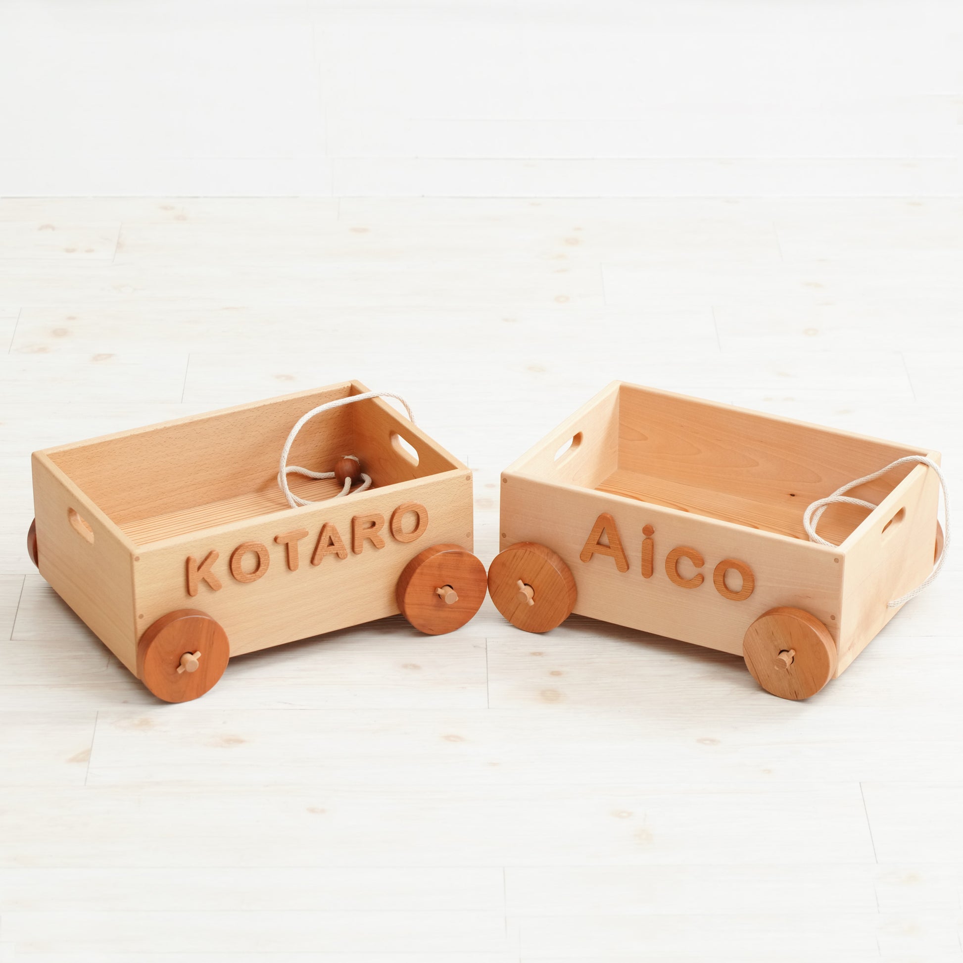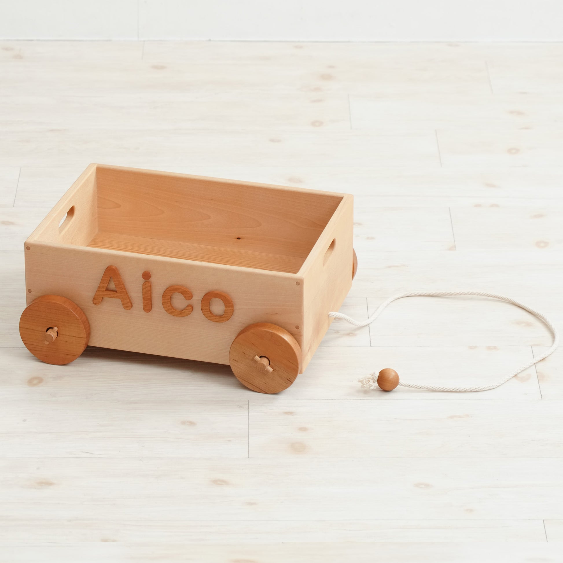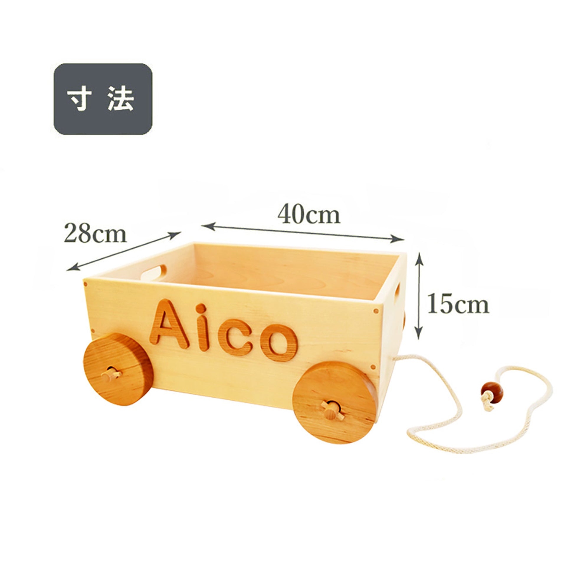 出産祝いやお誕生日などの贈答用に喜ばれる商品です。名前を入れた木のおもちゃ箱。紐を引っ張って遊びます。