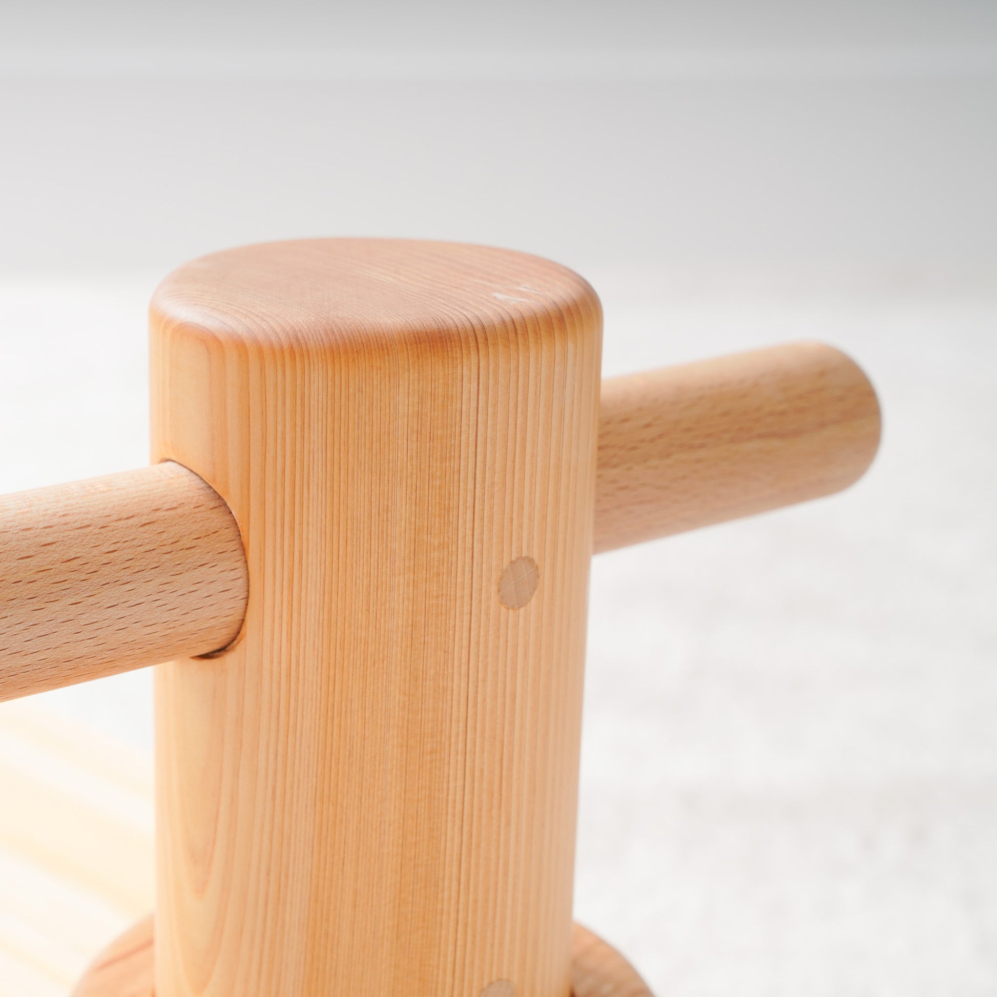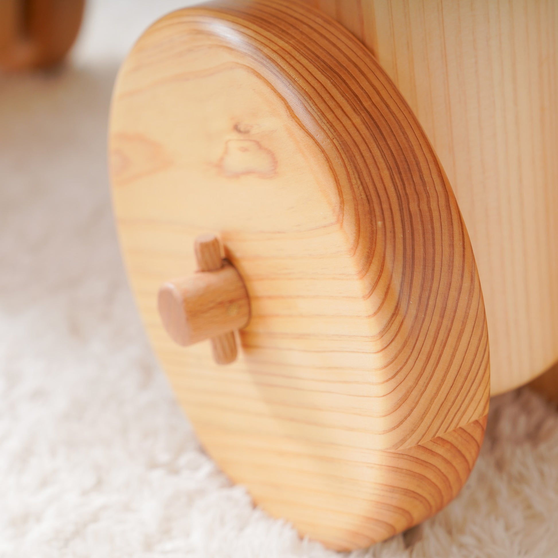 マンション住まいのお客様は、下階への音の響きが気になるのではないかと、購入をためらう方もいらっしゃいます。 ヒノキのタイヤは柔らかく、実際に使ったお客様の声では、さほど気にならないというご意見をたくさん賜ります。安心して使って下さい。