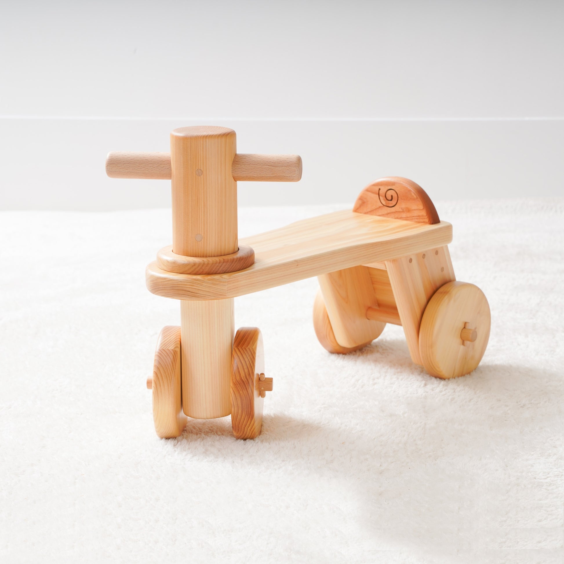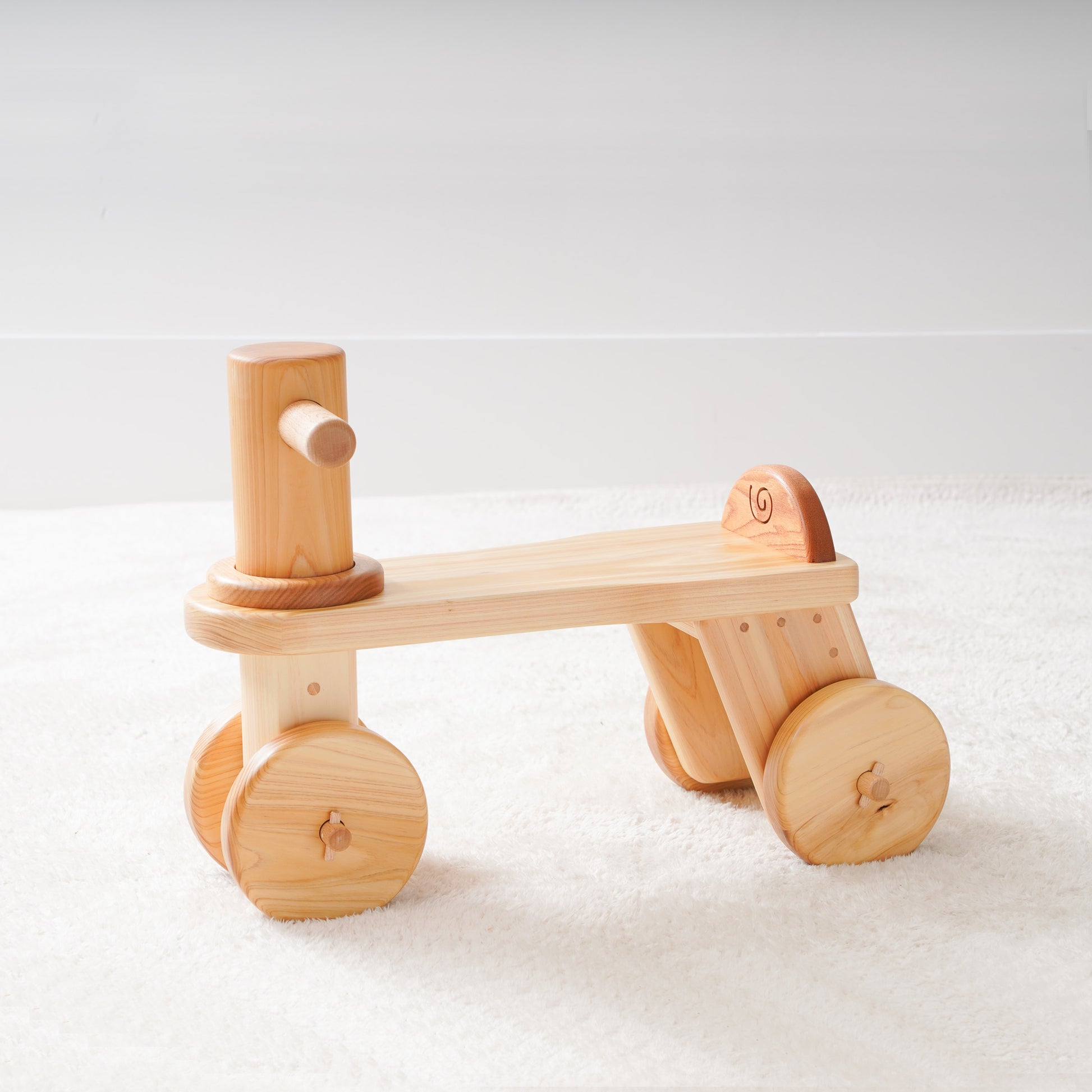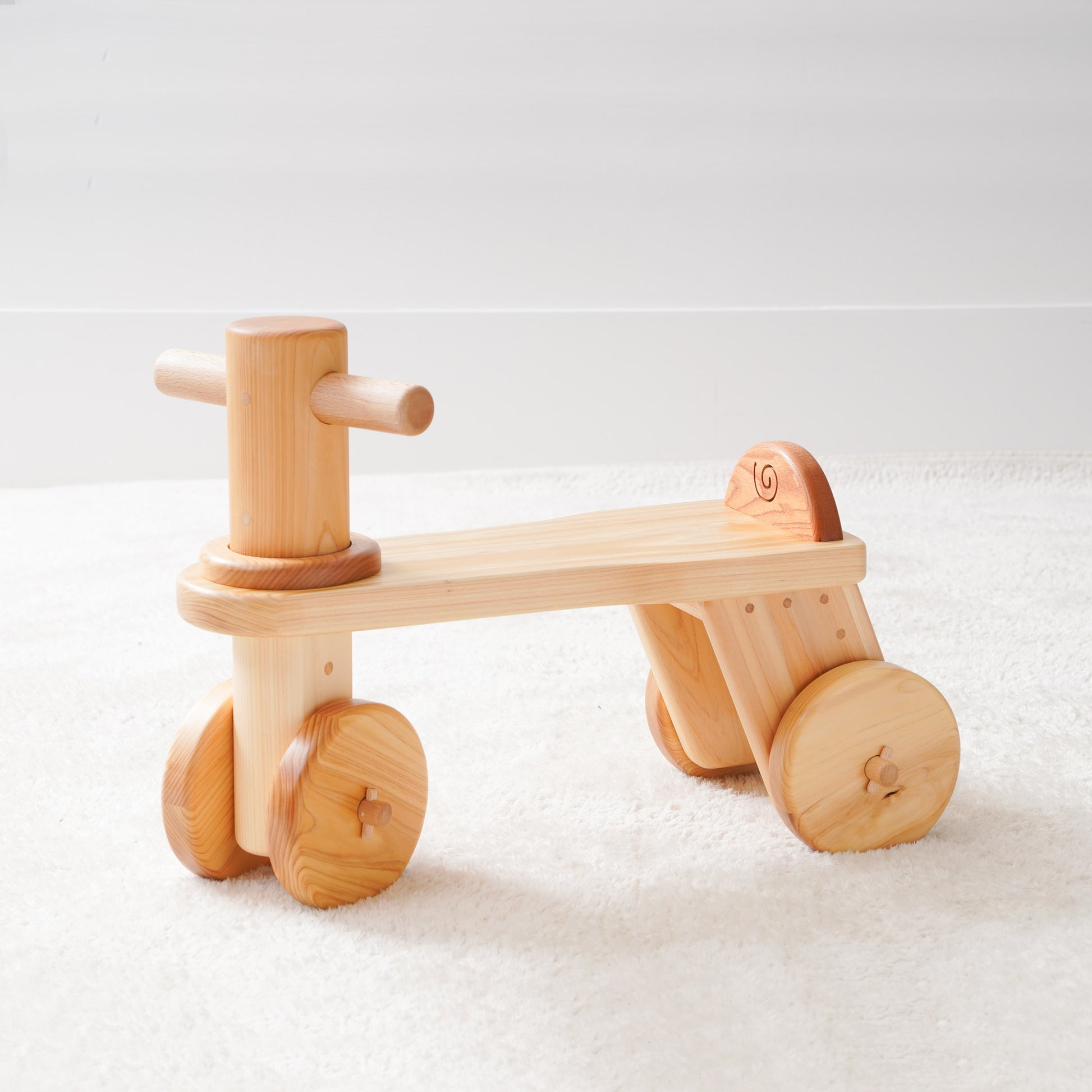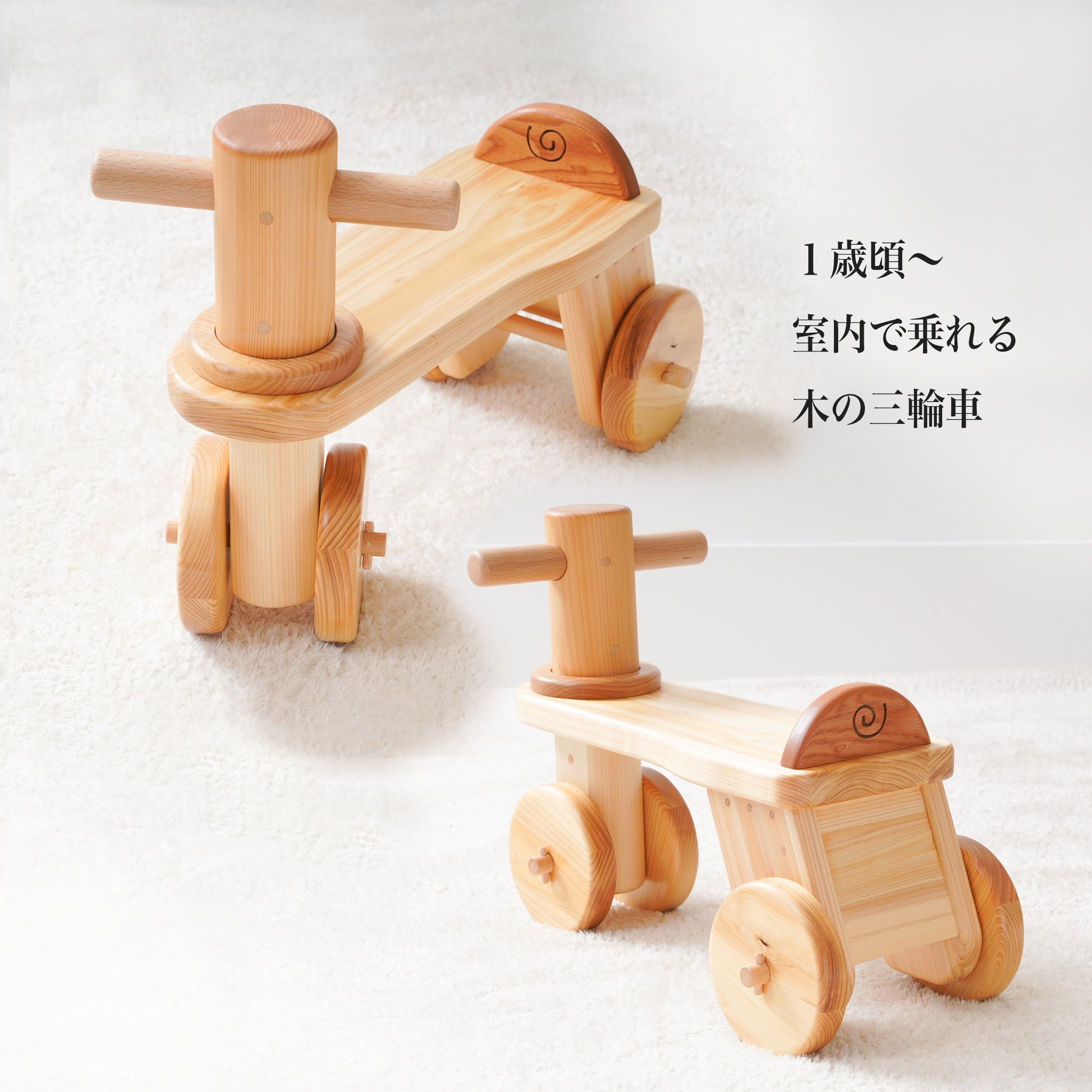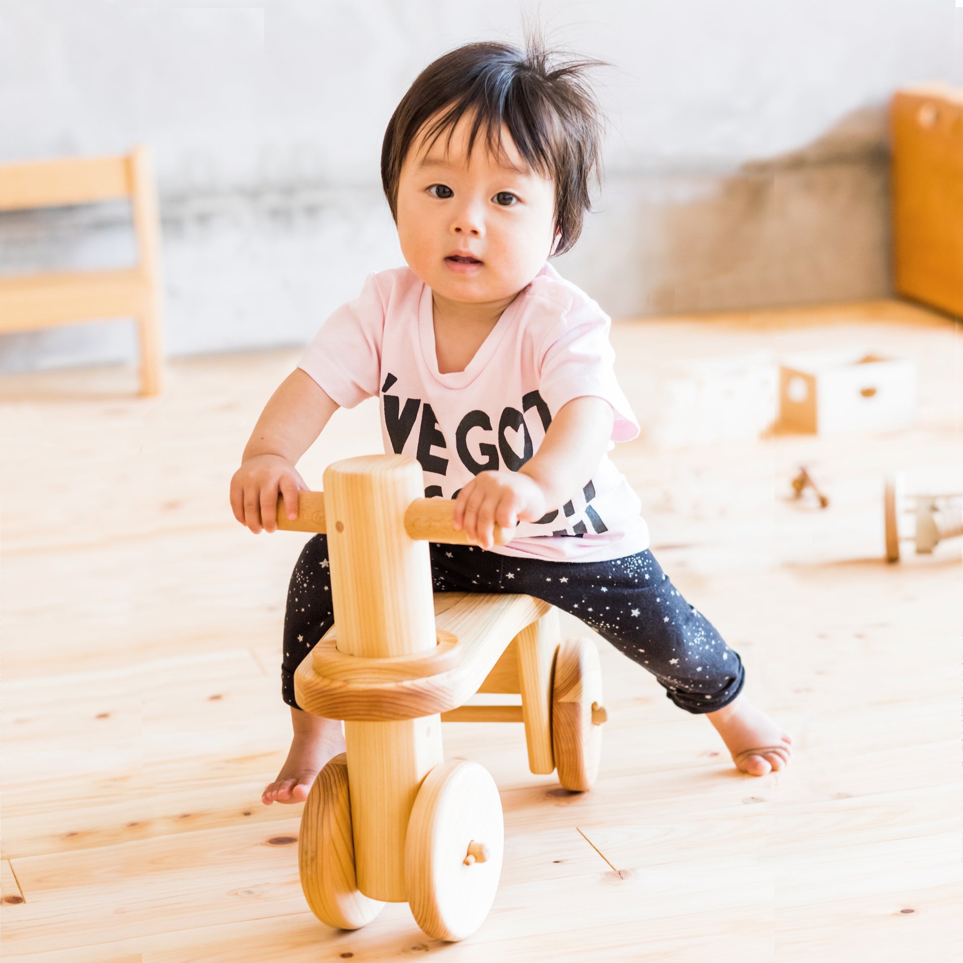 子供たちは動くもの、乗り物が大好きですね。乗り物に乗って動くことは、子供たちの成長の大事な1つなんだと思います。バランス感覚、運動感覚、いつもの歩く、走るでは味わえない感覚を感じる大事な遊びです。室内で乗れる木の三輪車。しっかりと丁寧に作られています。