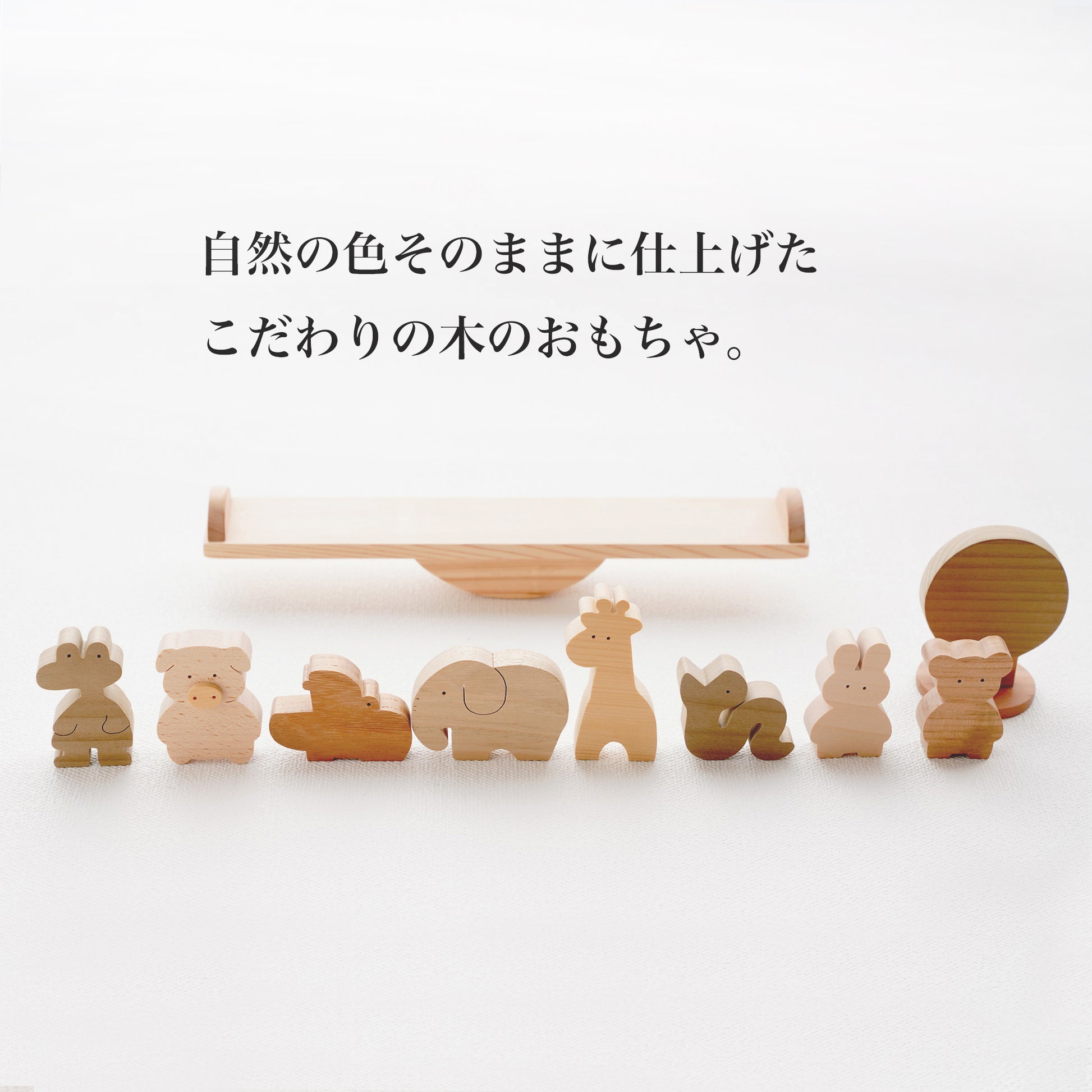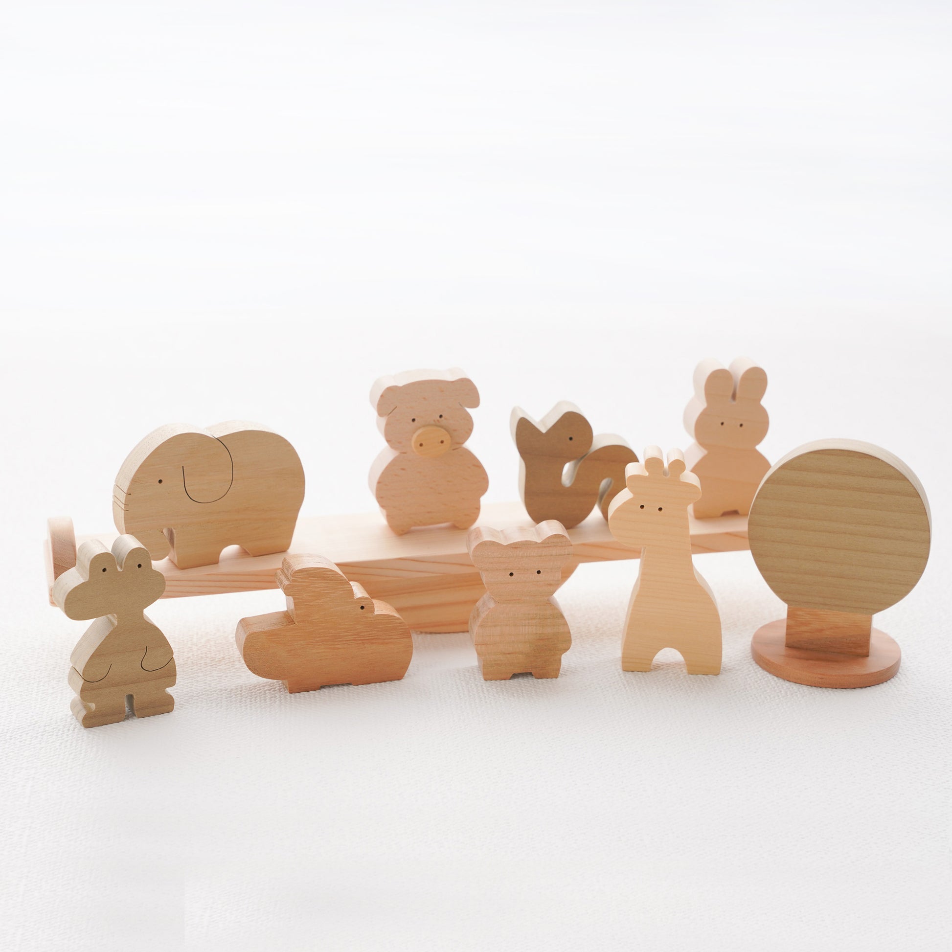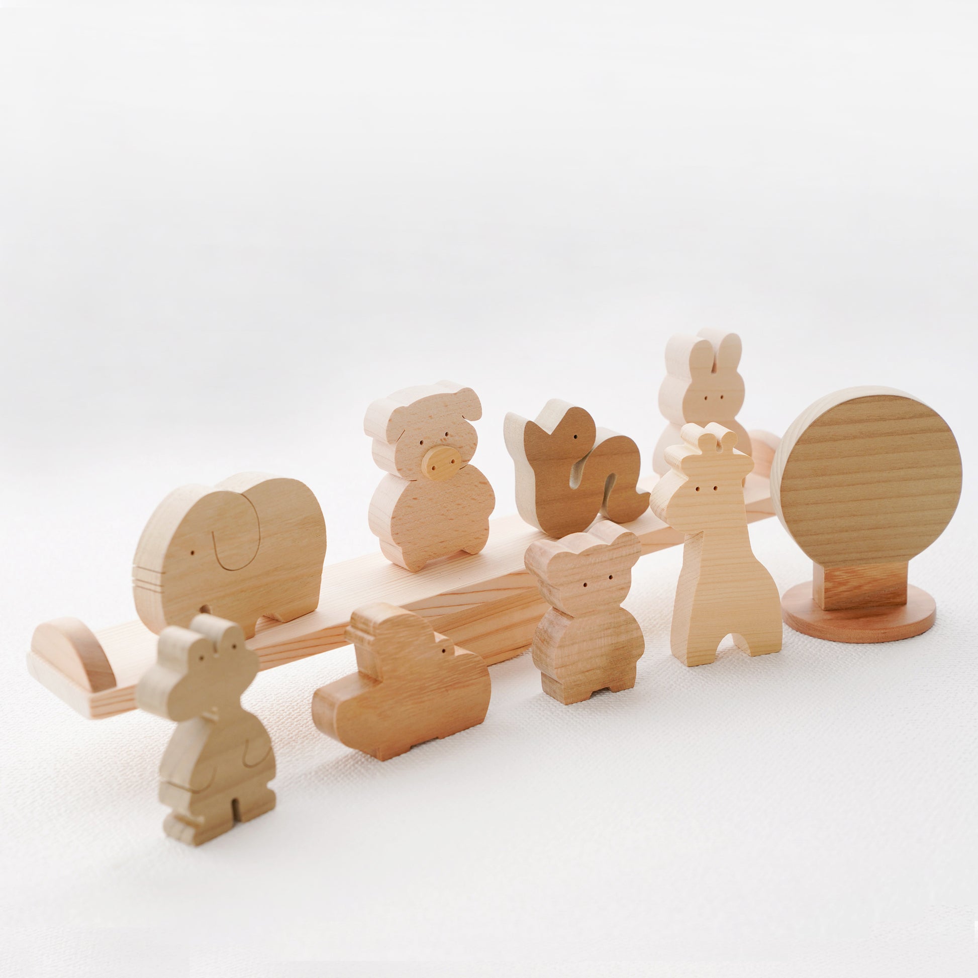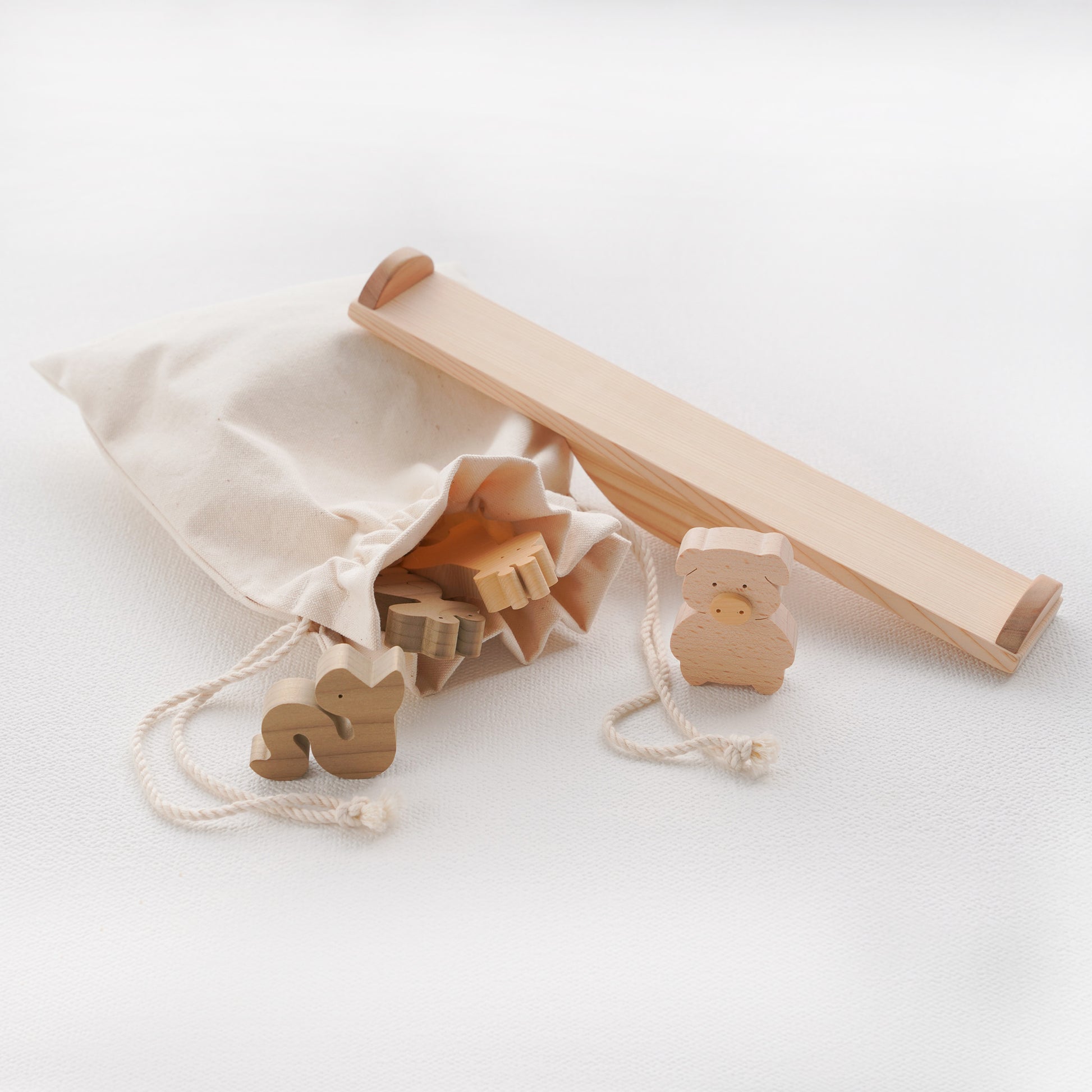 グッドトイ賞受賞の木のおもちゃ。動物たちがバランスを取りながらあっちに傾き、こっちに傾き。動物たちを指で移動させて全員を乗せてみよう。1歳のお誕生日にお勧めの木のおもちゃ