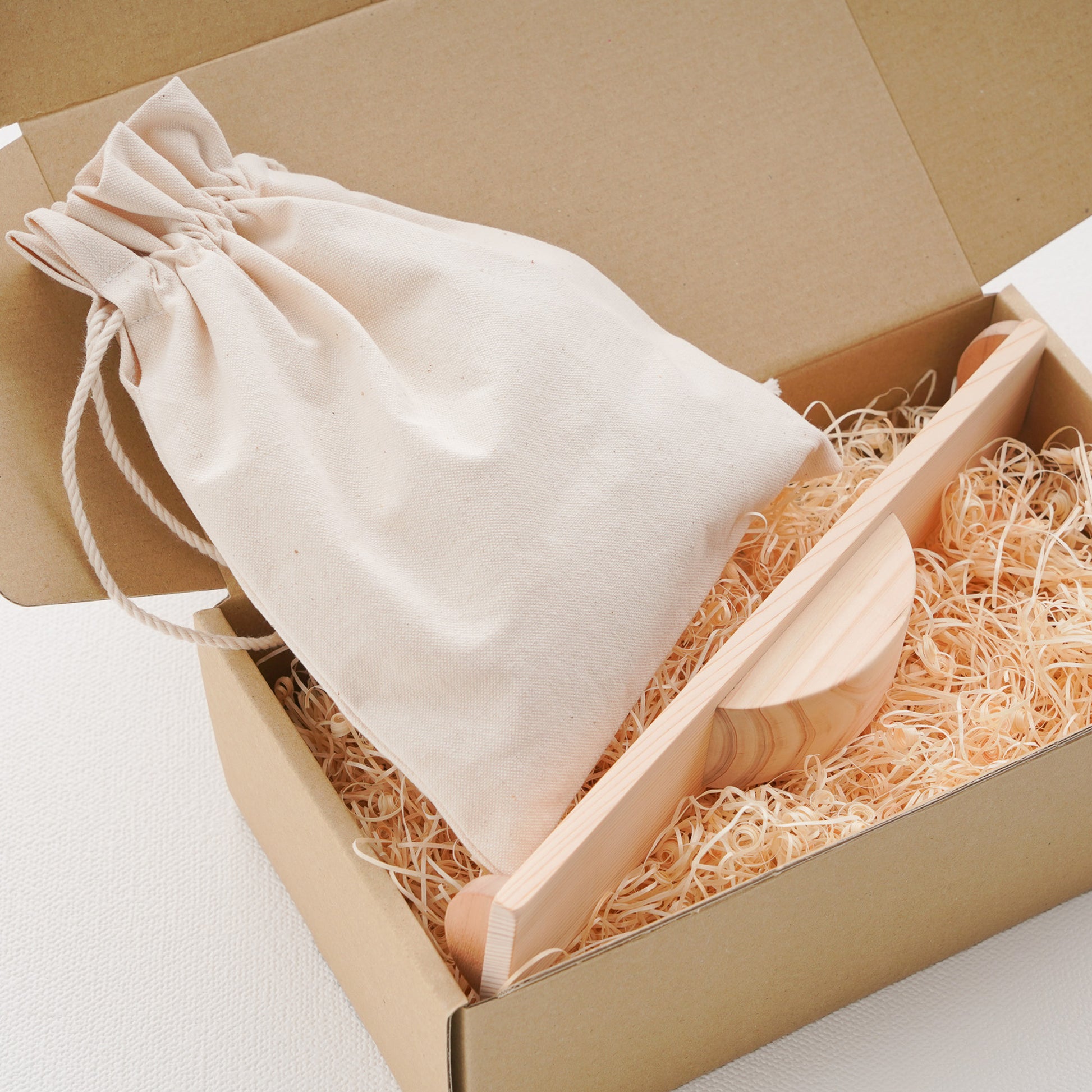 プラスチックの緩衝材ではなく、ひのきの木毛(もくめん)で包み開けた時の感動と共にお届けします。