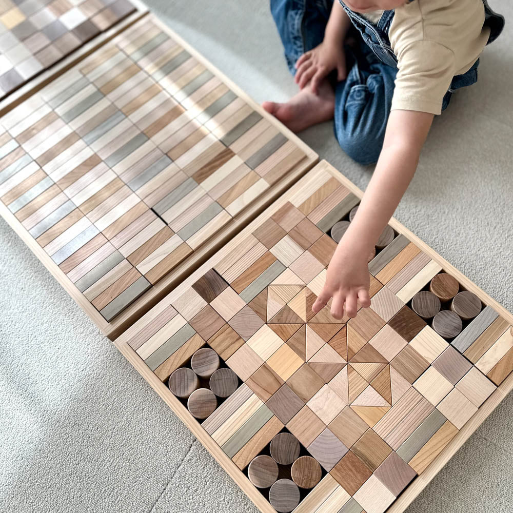 4cm基尺と精緻な仕上げで、ピタッと積める気持ちよさを実現。形やピース数の異なる3セットから、年齢や遊び方に合わせて選べます。親子で感性と創造力を育みながら、長く楽しめる積み木です。
