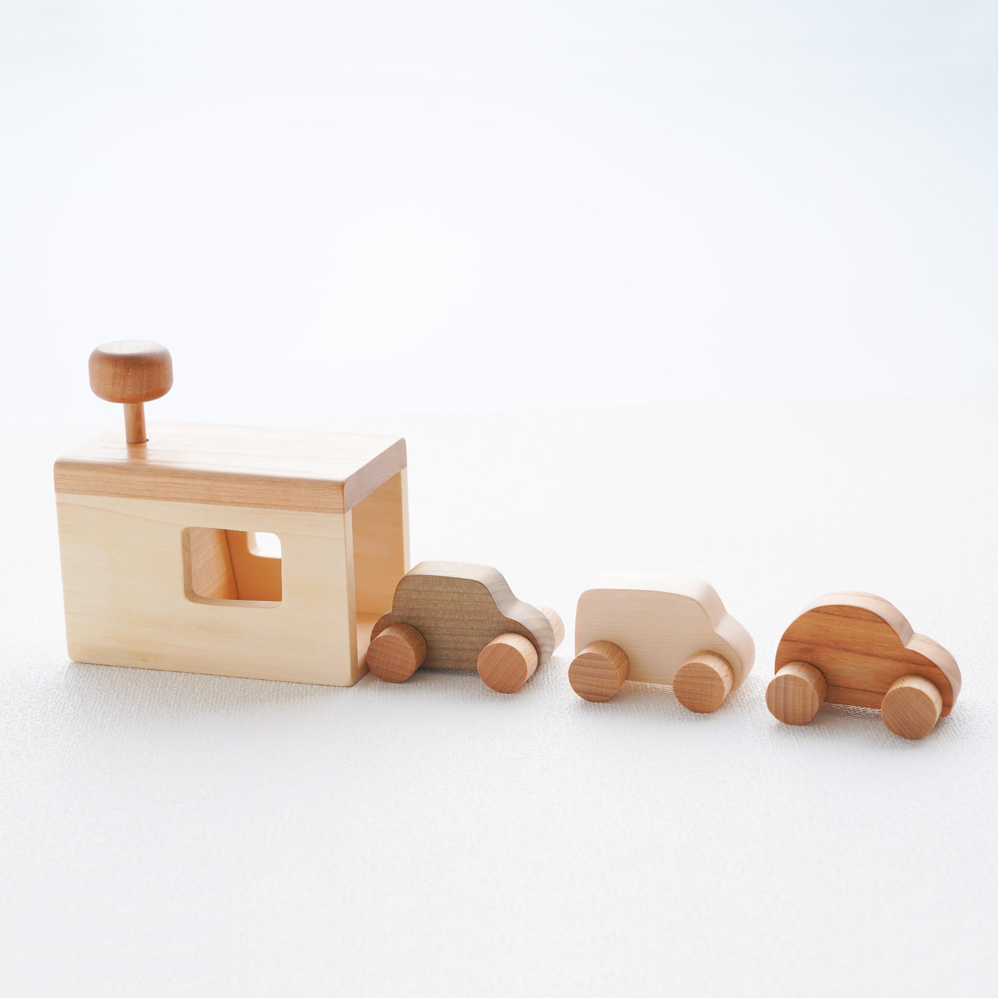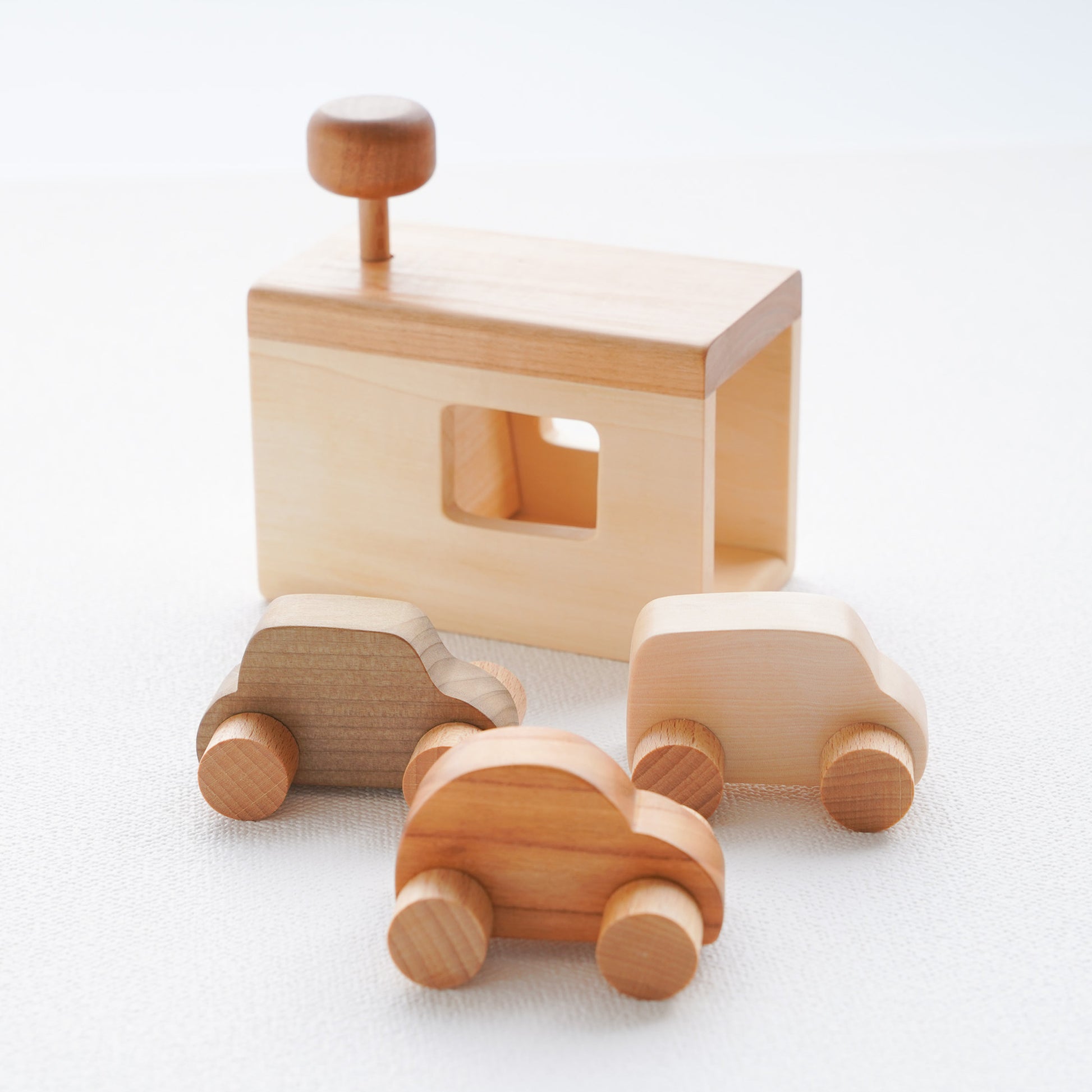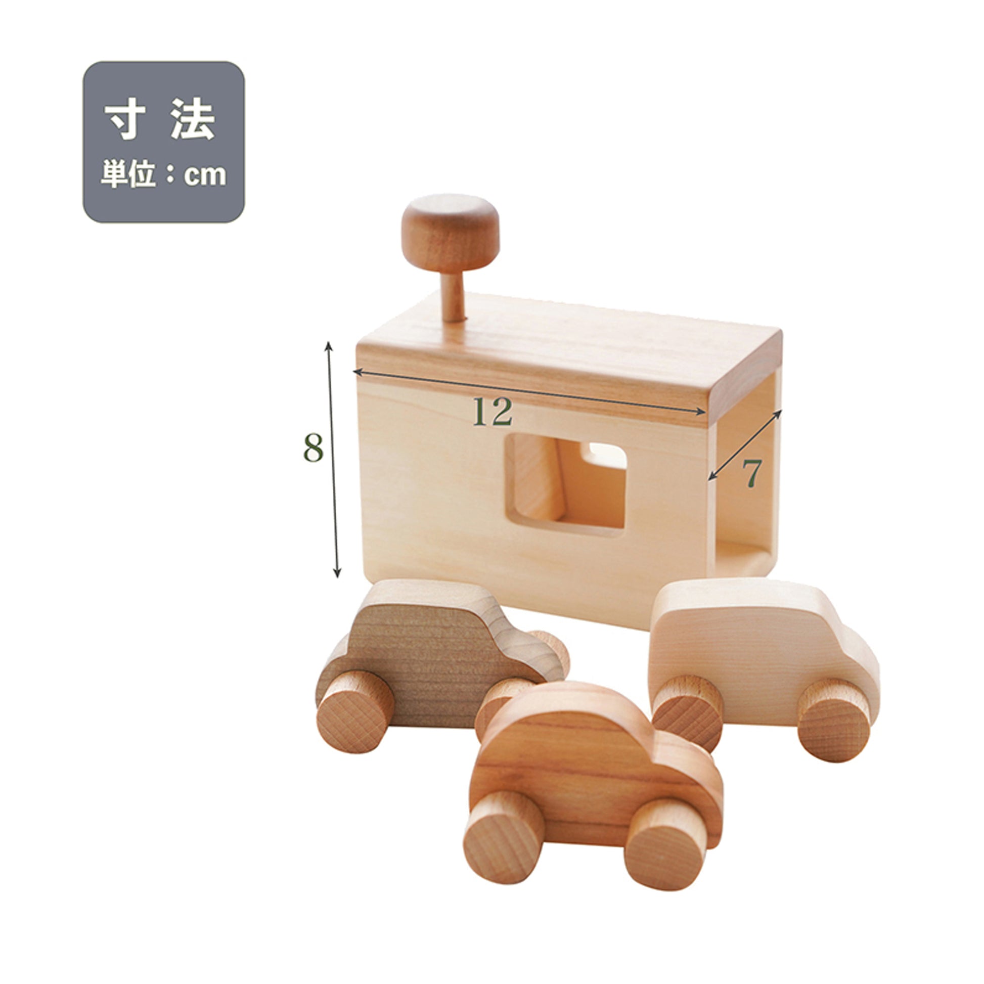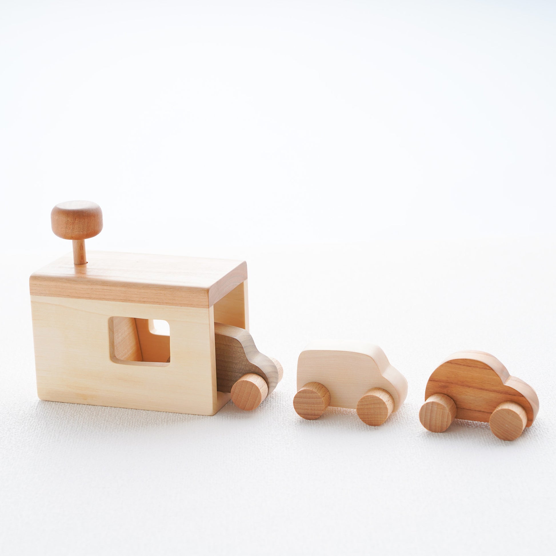 木のおもちゃ専門店なかよしライブラリーが製作する押すと飛び出すおもちゃ【スタートハウス】です。この商品は台と車が3台ついています。。ボタン一つで飛び出す車は、手加減次第でゆっくりも、早くもできる。1歳からの木の車のおもちゃとして愛用されています。子どもの1歳のお誕生日プレゼント(贈答用)に喜ばれています。国産材使用、植物油で口に入れても安心レベルの高品質な木のおもちゃです。