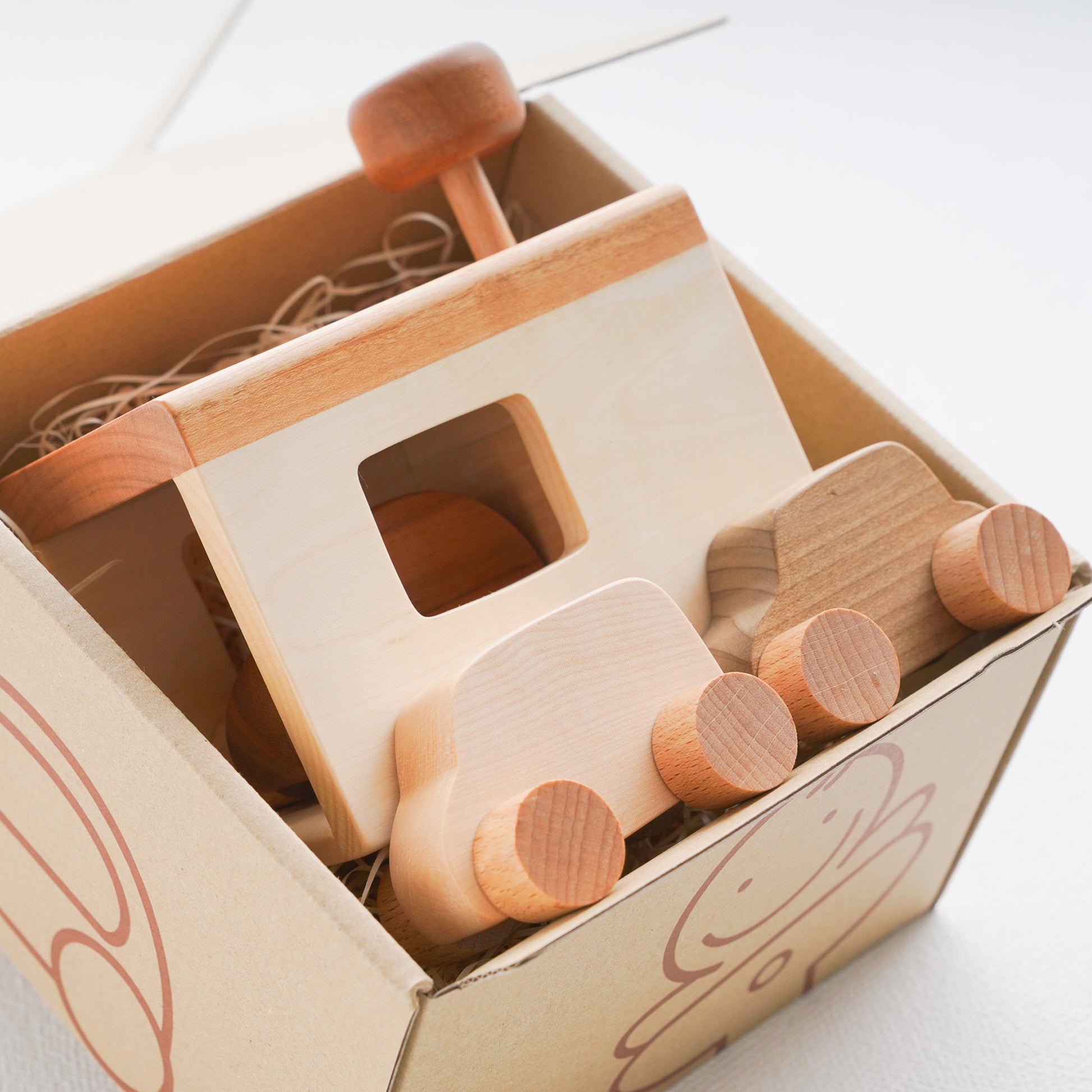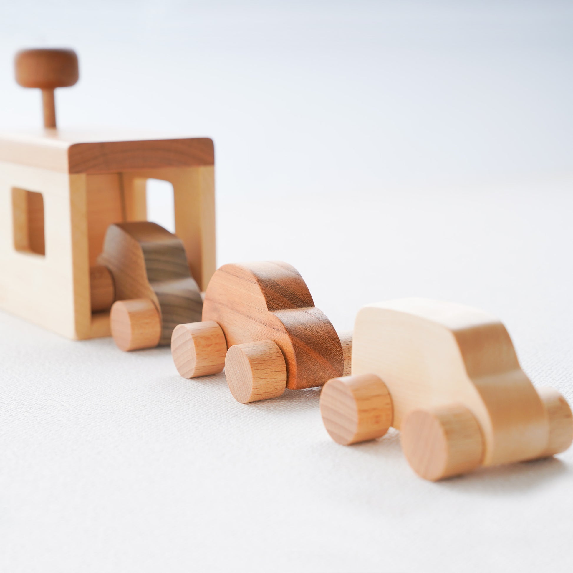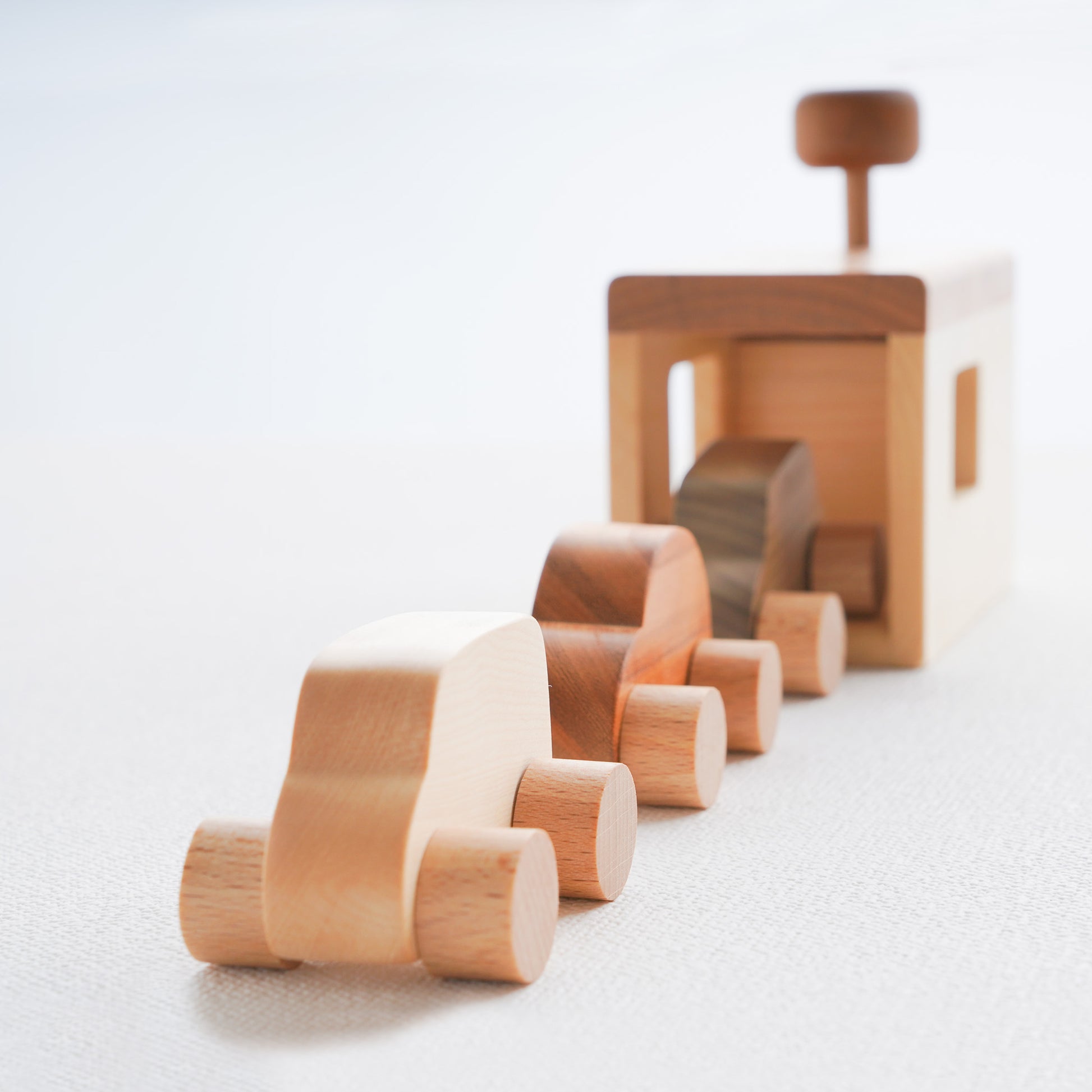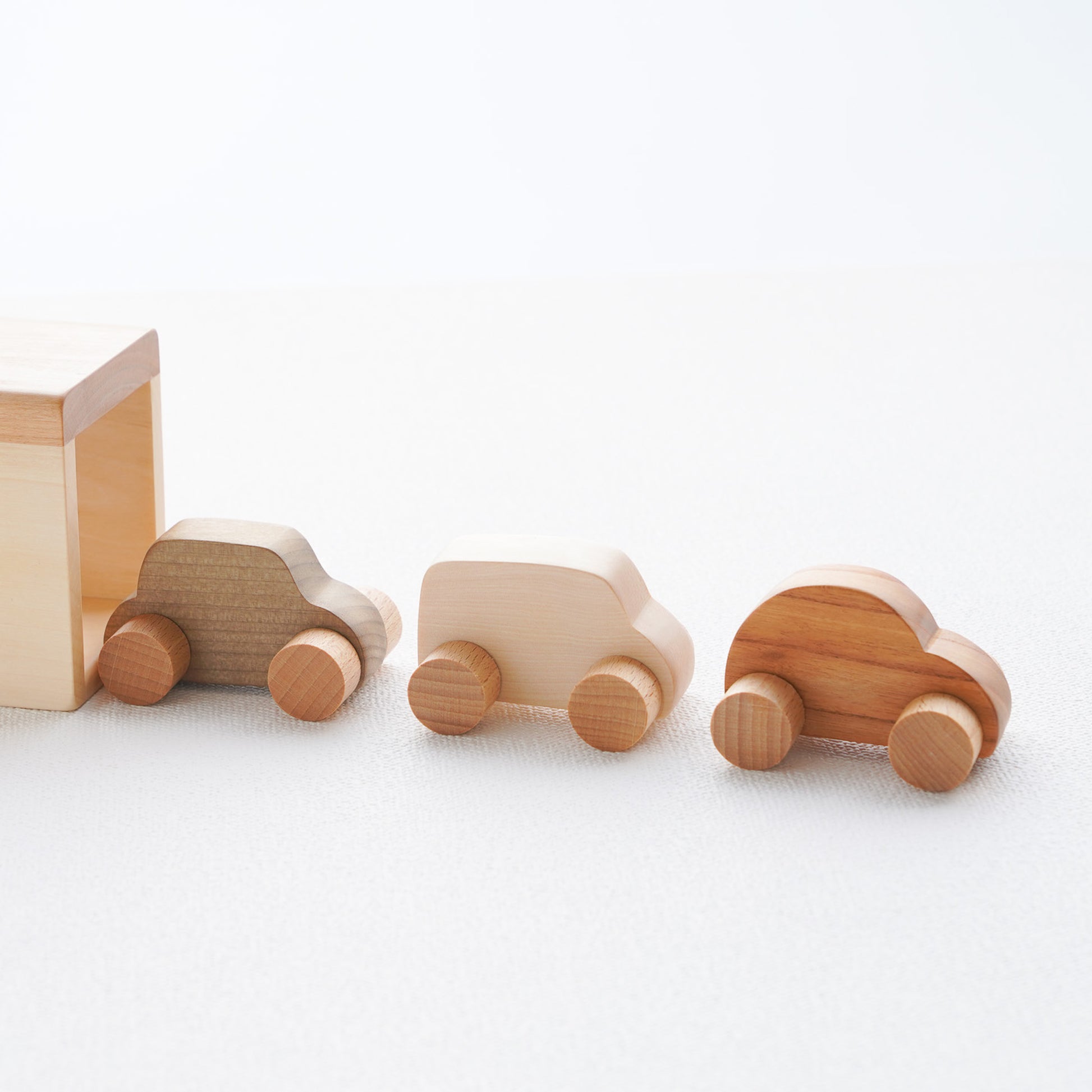 木のおもちゃ専門店なかよしライブラリーが製作する押すと飛び出すおもちゃ【スタートハウス】です。この商品は台と車が3台ついています。。ボタン一つで飛び出す車は、手加減次第でゆっくりも、早くもできる。1歳からの木の車のおもちゃとして愛用されています。子どもの1歳のお誕生日プレゼント(贈答用)に喜ばれています。国産材使用、植物油で口に入れても安心レベルの高品質な木のおもちゃです。