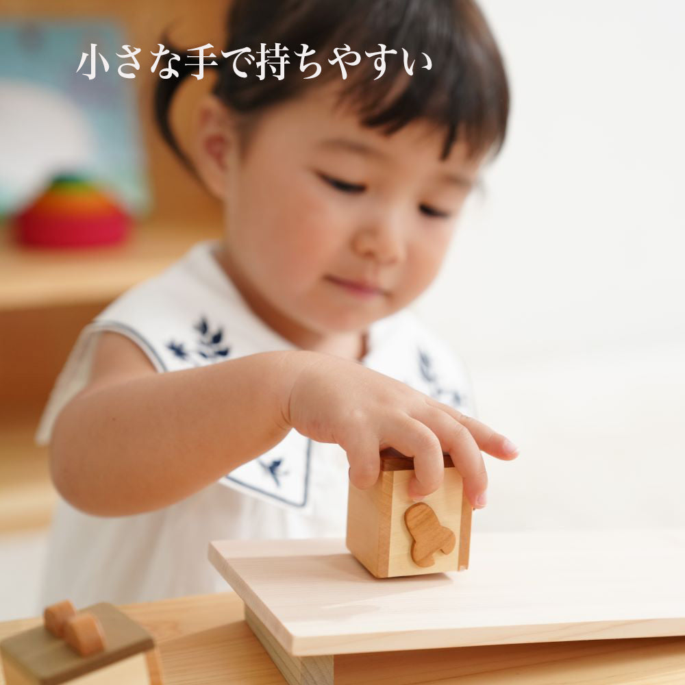 材質は広葉樹でさくら、ケヤキ、トチの木を使います。 着色料は一切使用せず、天然木そのものの風合いを大切に。木のぬくもり・手触り・香りを全身で感じながら遊ぶ体験が、お子様の五感を豊かに育みます。