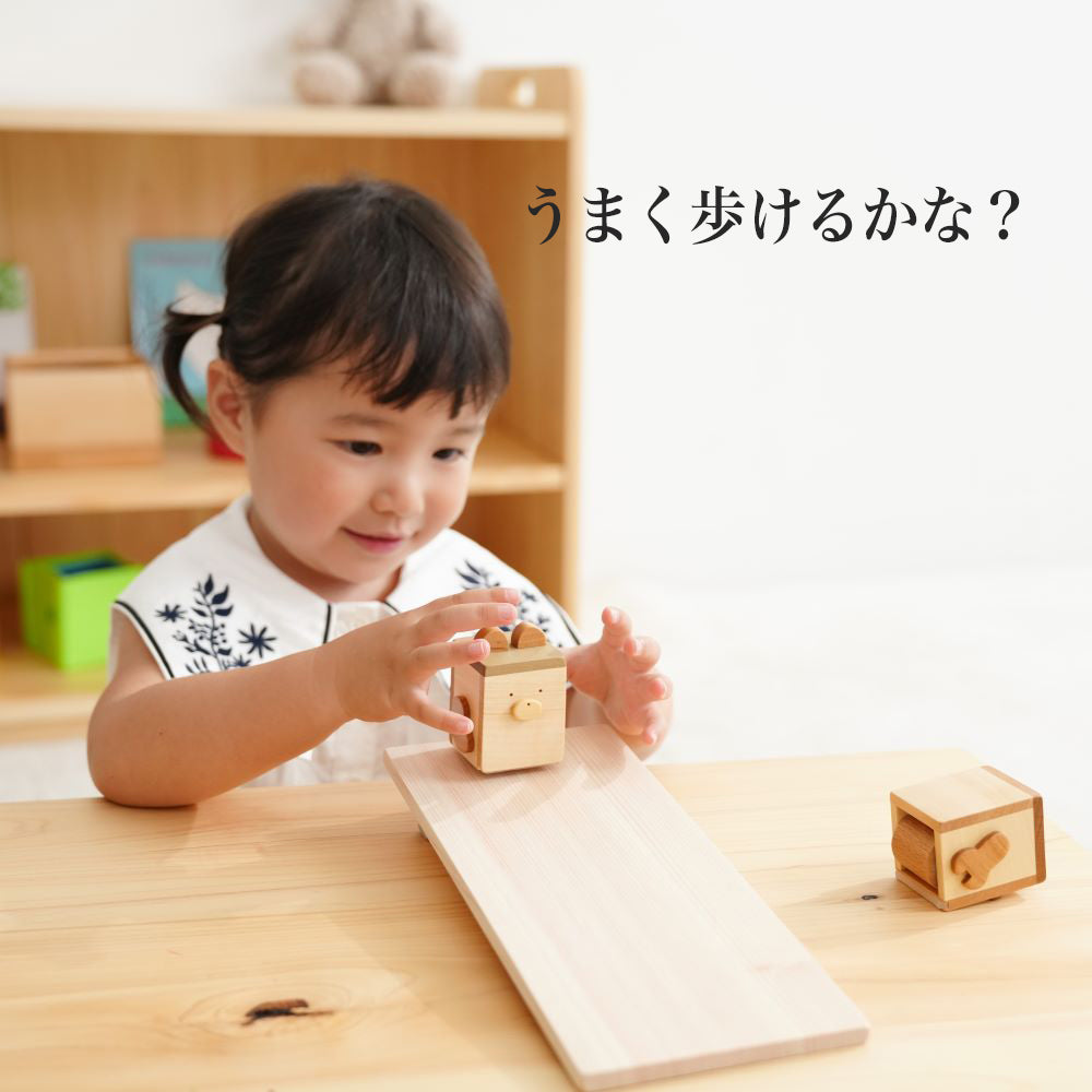 置く角度やスタート位置を変えるだけでも動きに変化が見られ、ただ見ているだけでなく、”どうしたら上手く歩くか”を考えながら遊ぶことができます。