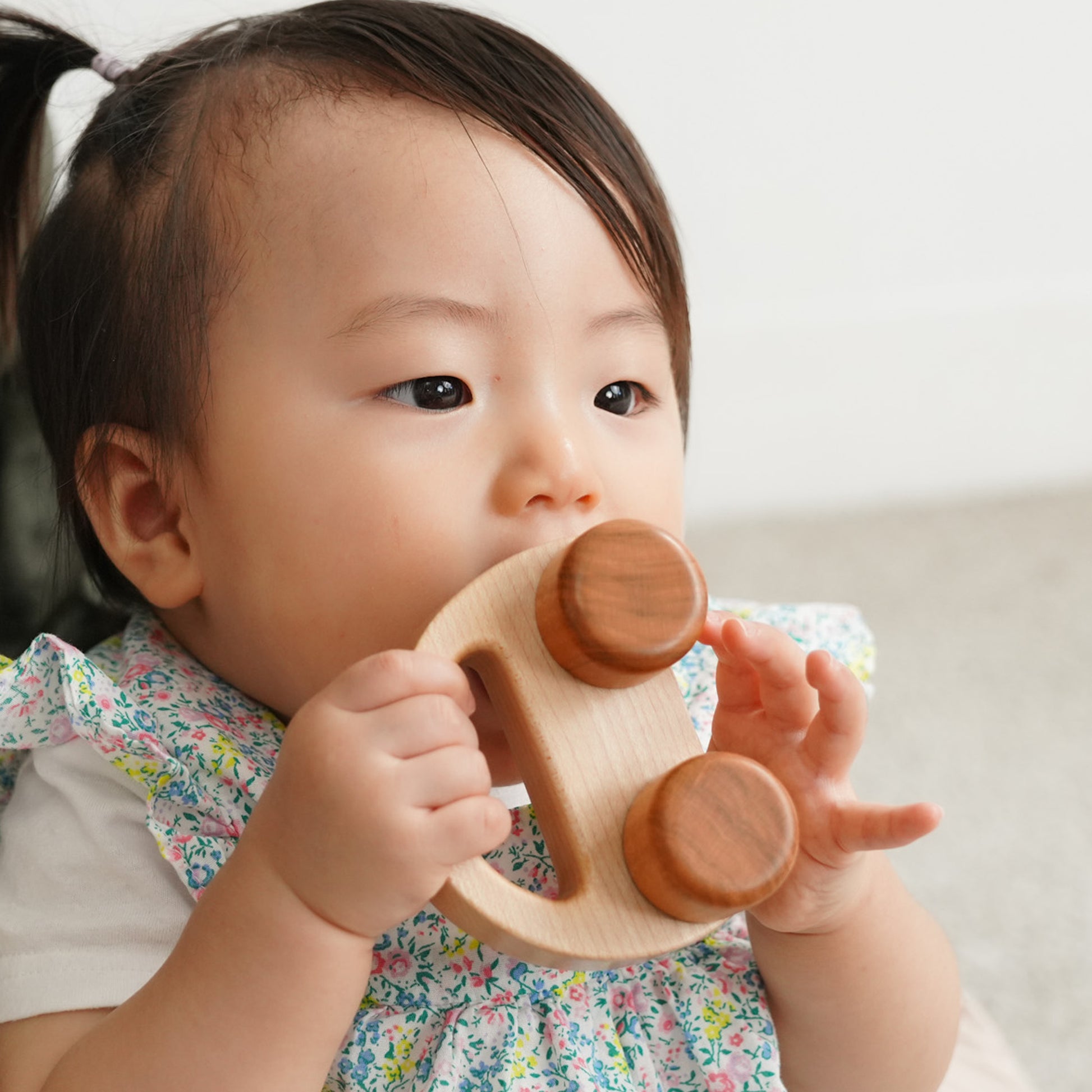 木の車は左右対称の半円型にタイヤが付いた形です。車という認識もまだできない6か月〜10か月頃。床で動かすとスムーズに進むだけで赤ちゃんは楽しく遊べます。