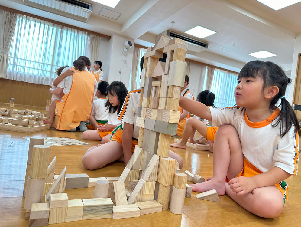 The newly completed building blocks arrived at Kashikinoki Kindergarten in Omonomachi, the city, in early June. The children immediately enjoyed checking out the scent of the brand new blocks and stacking them.