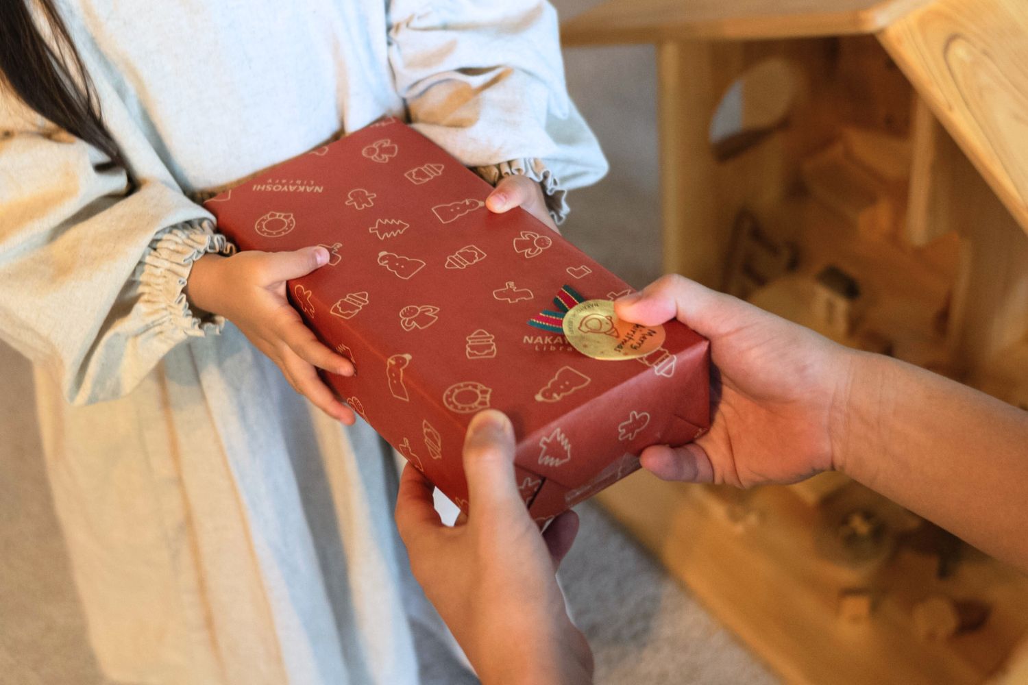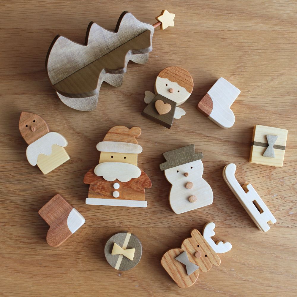 Wooden Christmas decorations made by Nakayoshi Library, a specialty wooden toy store.