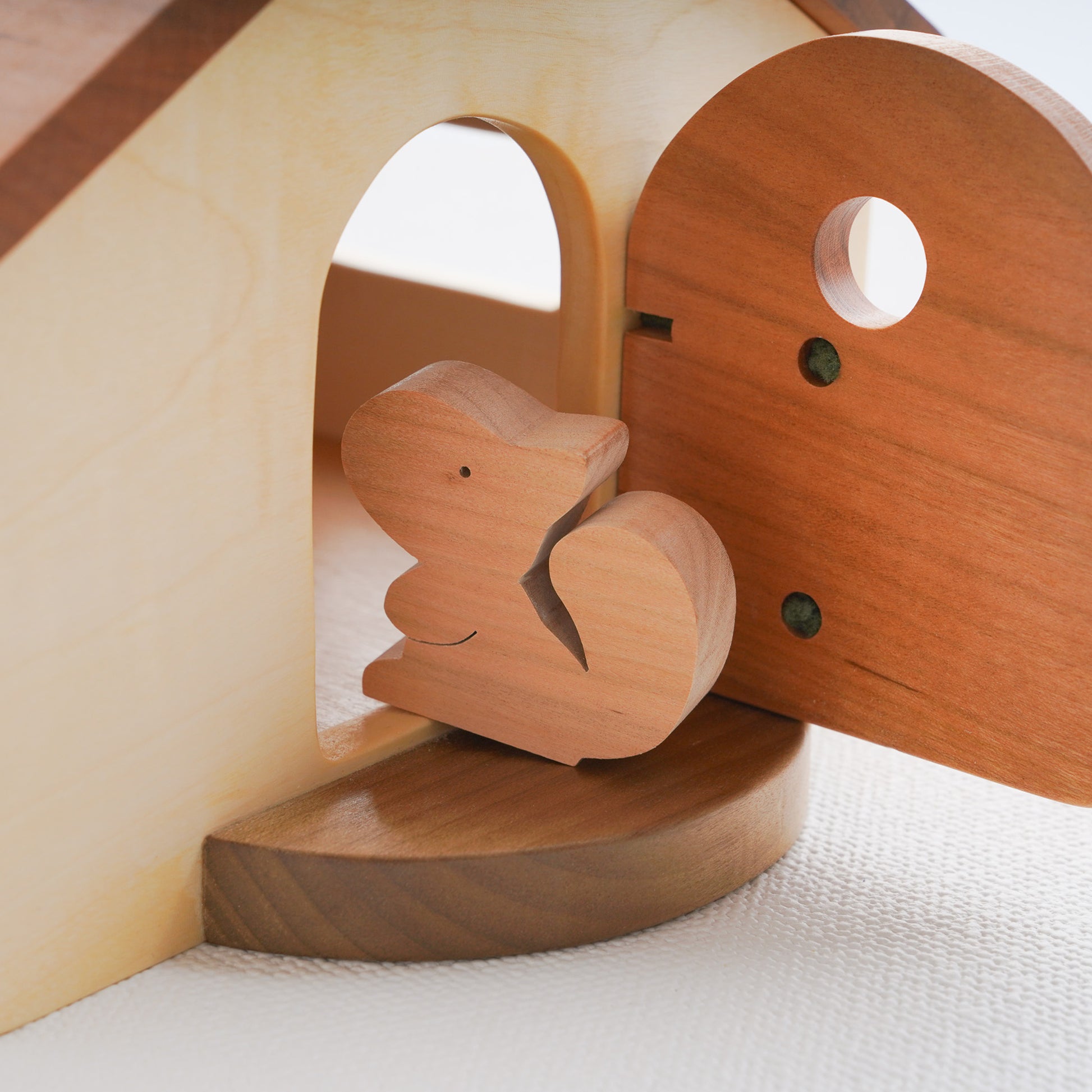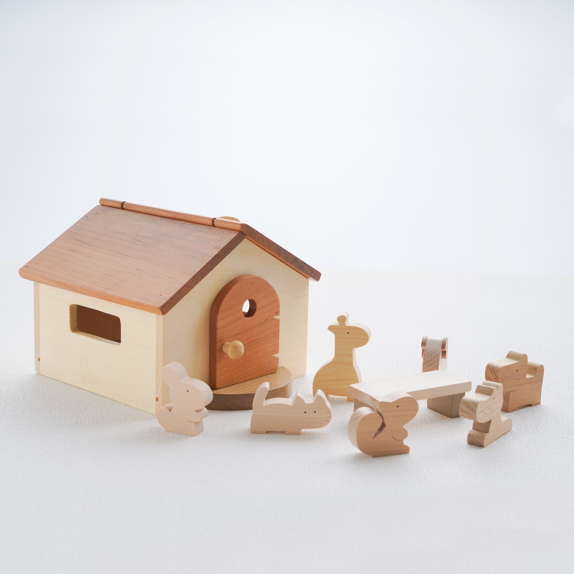 Animal dolls and a wooden house. A pretend animal house that can tell lots of stories.