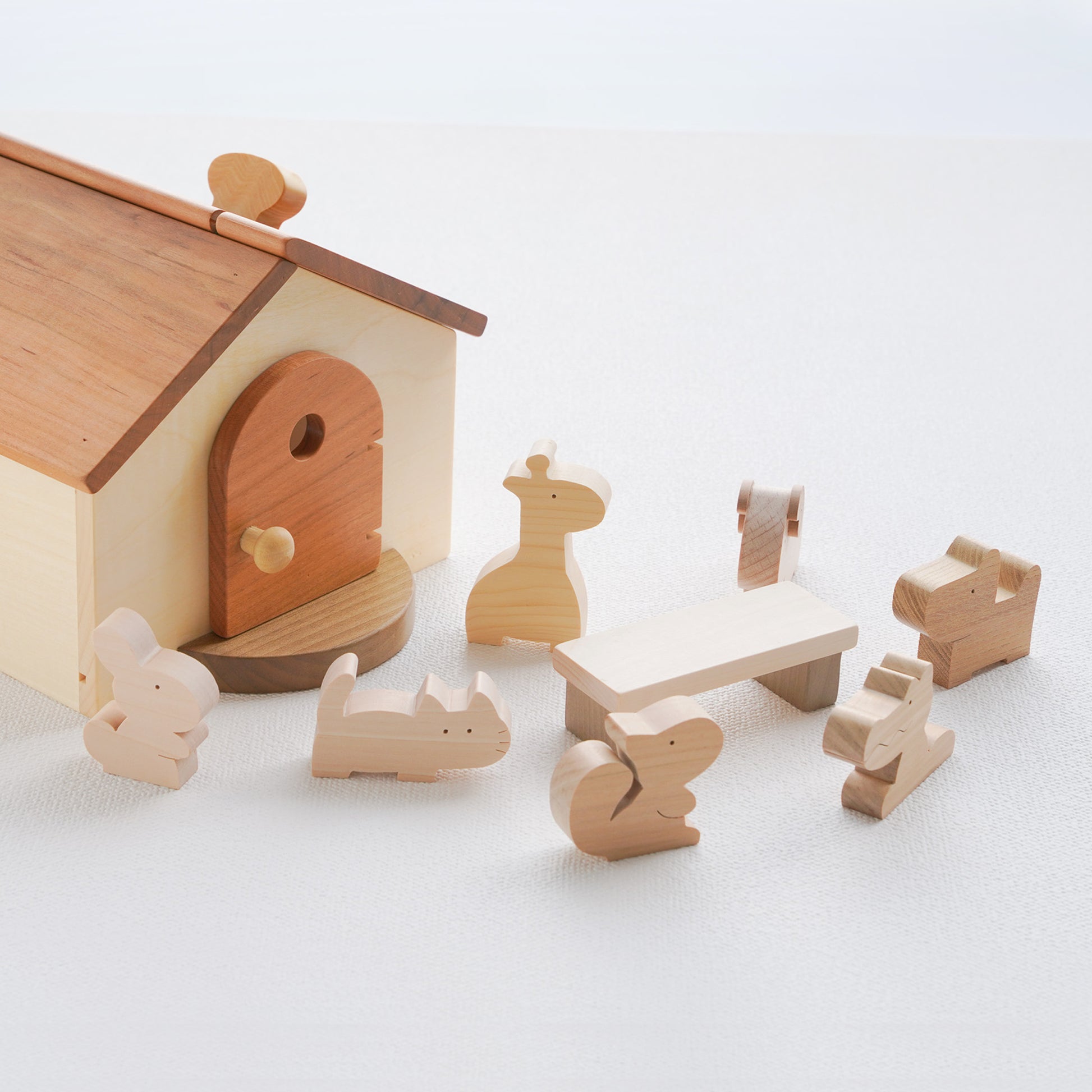 This is a set of animals and houses made by Nakayoshi Library, a specialty wooden toy store. In this product, forest animals gather in a triangular-roofed house and start a chat. This is a wooden toy that you can play with and create your own story. It is a popular gift for a child's 2nd birthday. It is a high-quality wooden toy made from 100% domestic wood and vegetable oil, so it is safe to put in your mouth.