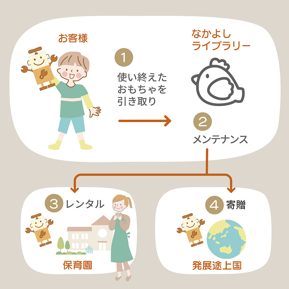 一般家庭で使い終わったおもちゃを回収し、丁寧にメンテナンスを行ったうえで、次の保育の場へとつないでいます。