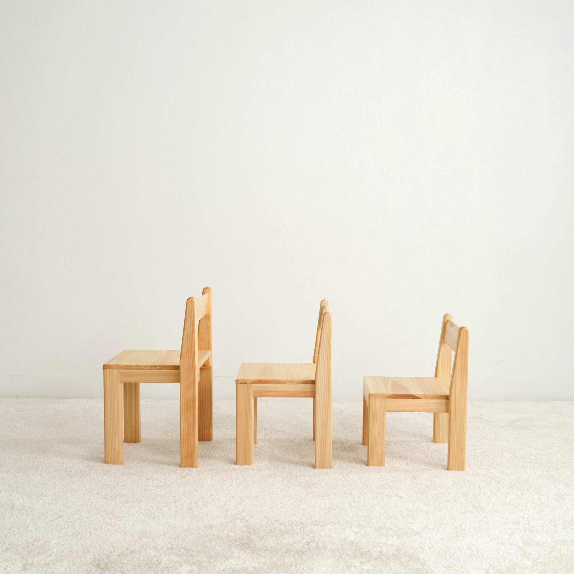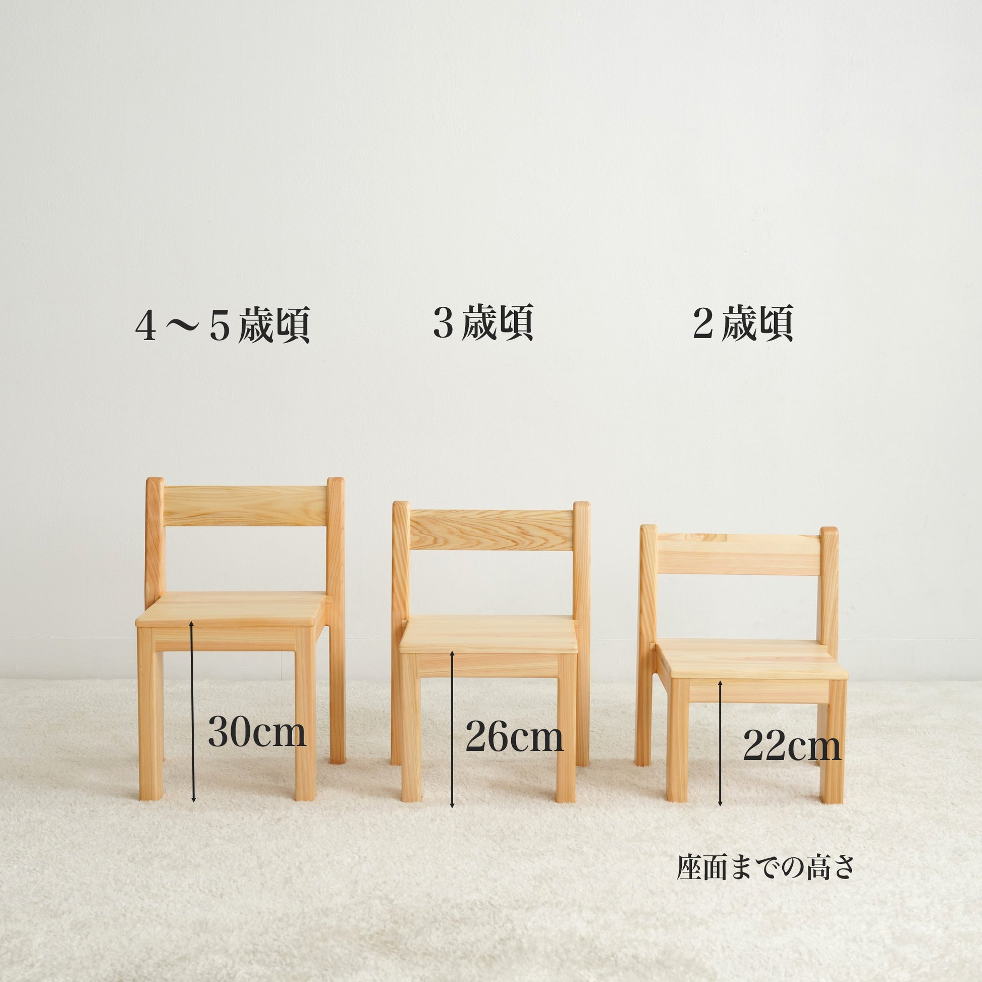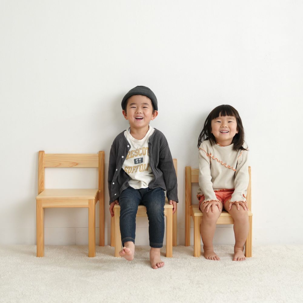 ご家庭ではワンサイズ大きめをと考えがちですが、その時の年齢に応じて高さを決めていただくことをおすすめしております。木の椅子はきっとお部屋になじんできます。家族の一員として大切にご使用ください。