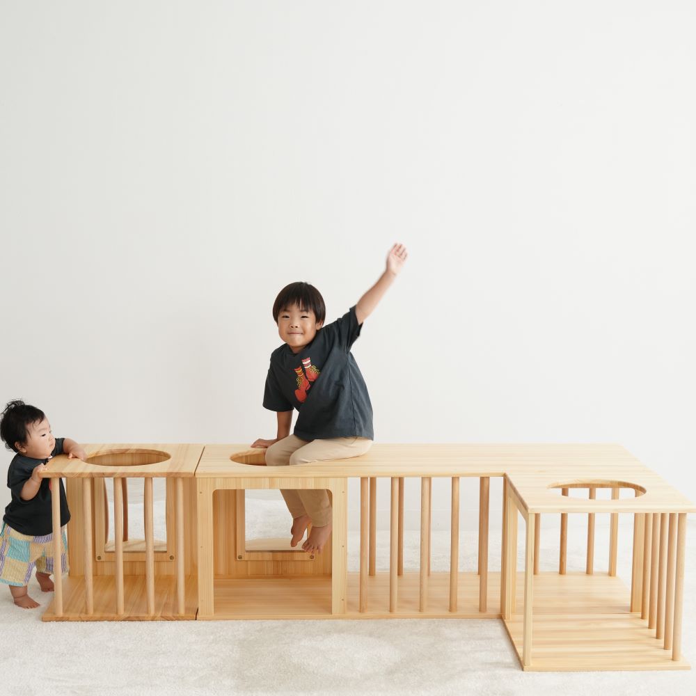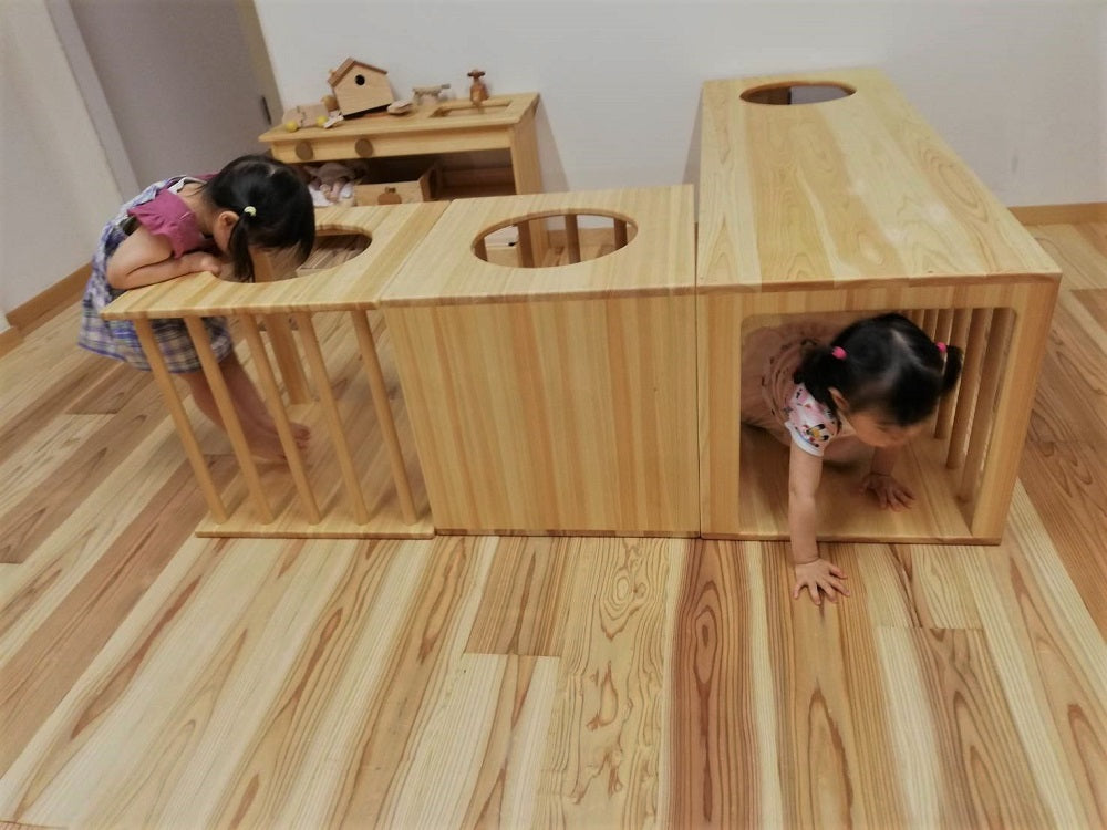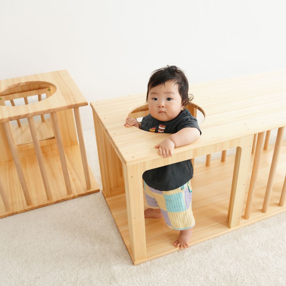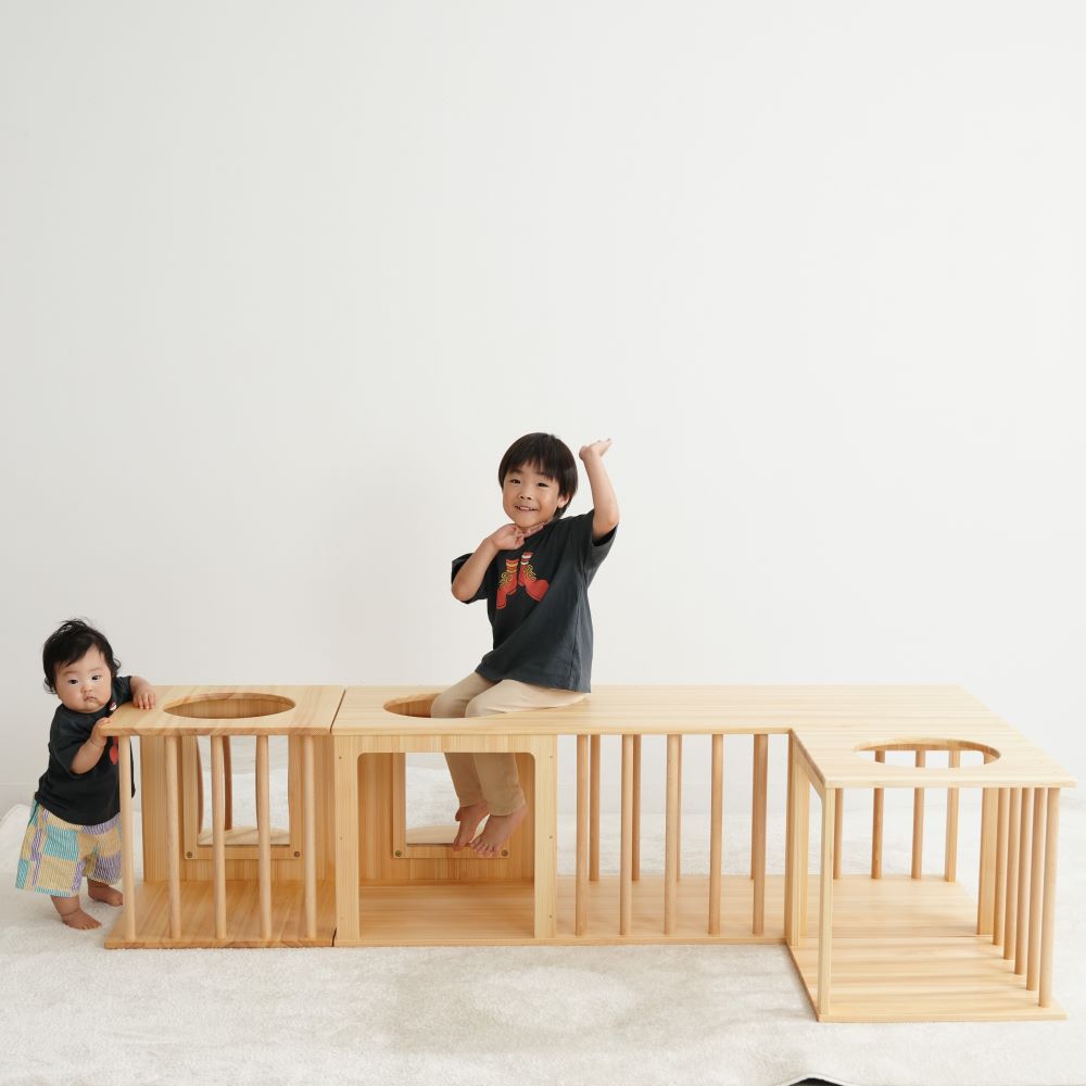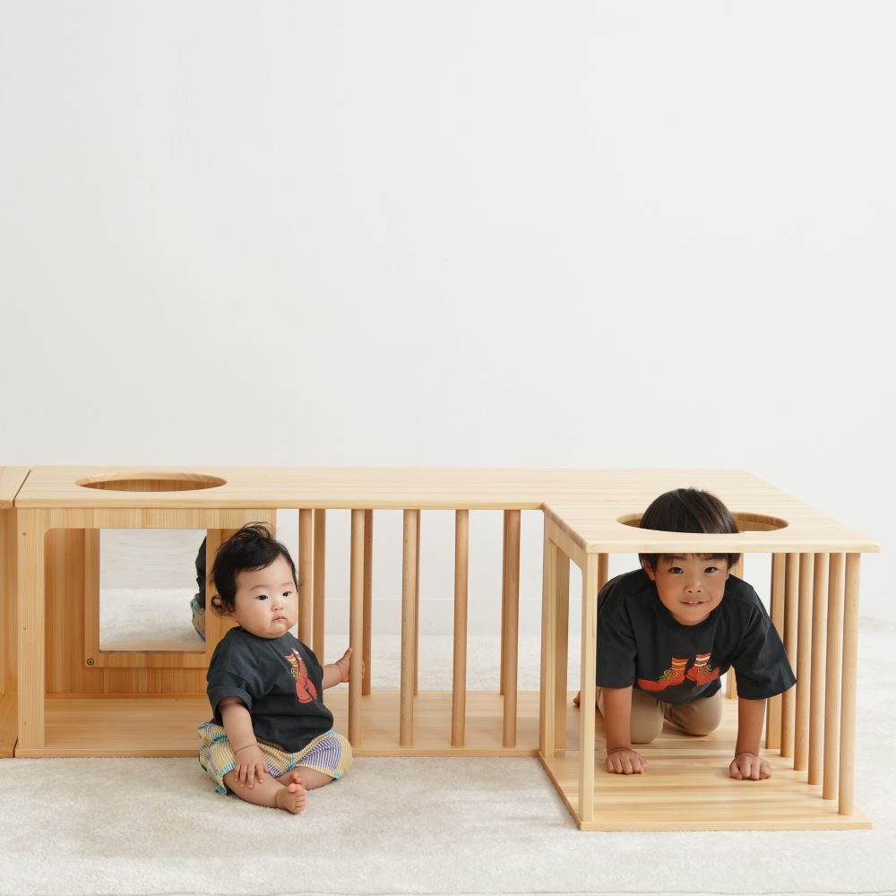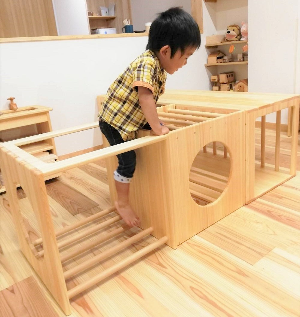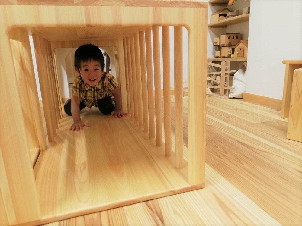 大サイズブロックは幅150cmあります。子どもたちはどの方向からも出入りすることができます。上の穴、サイドに設けられた開口部。重要なのは完全に仕切られている閉鎖的な空間ではなく、外部のお母さんの様子が確認できるということです。お母さんの目が届くことが子どもにもお母さんにも安心感を与えてくれます。