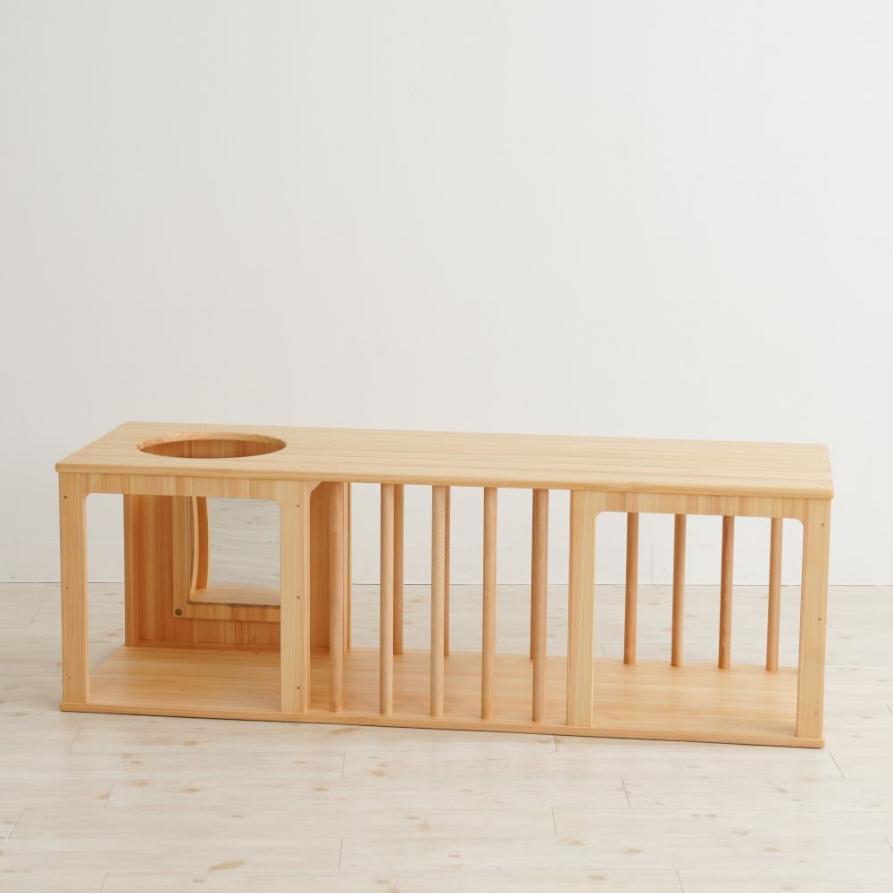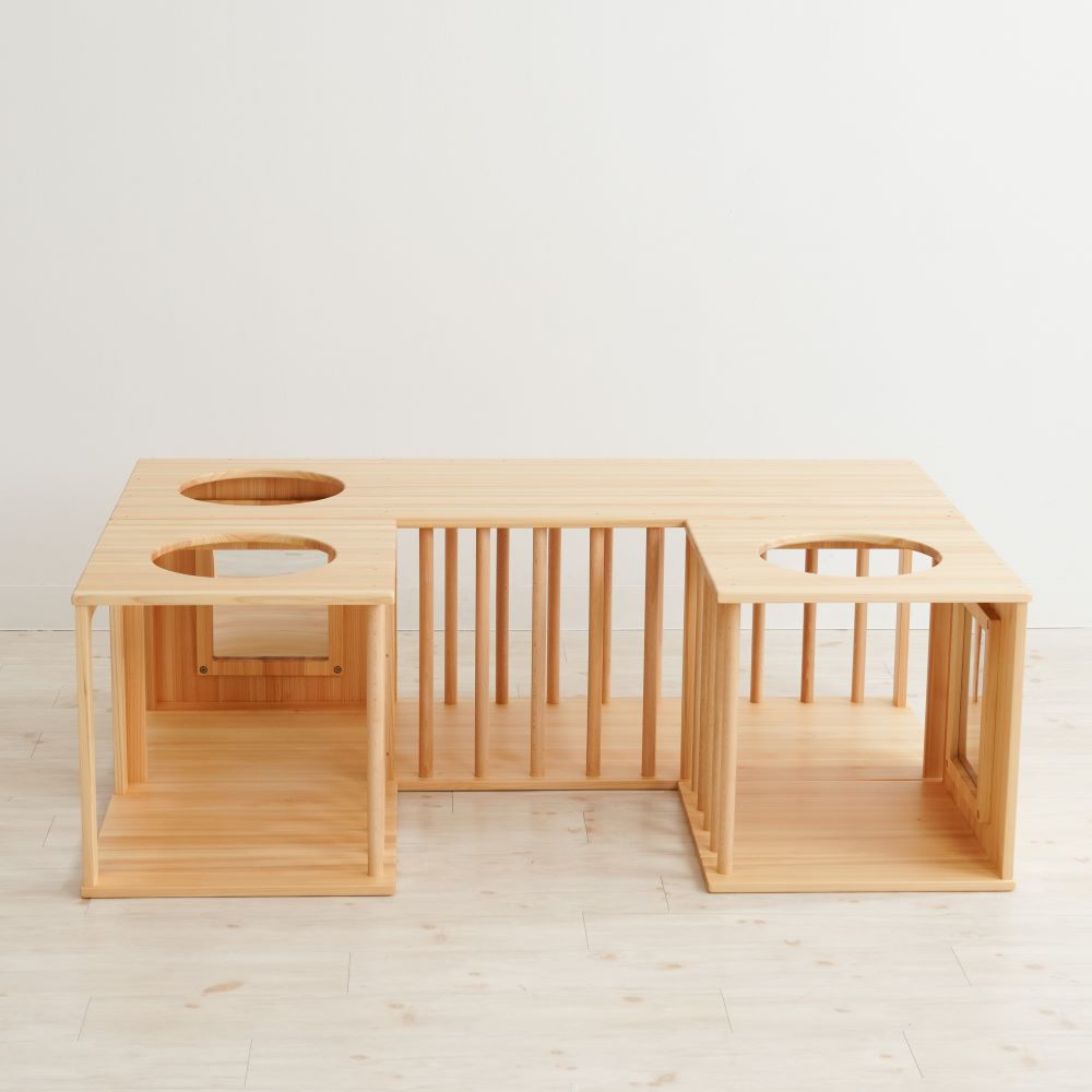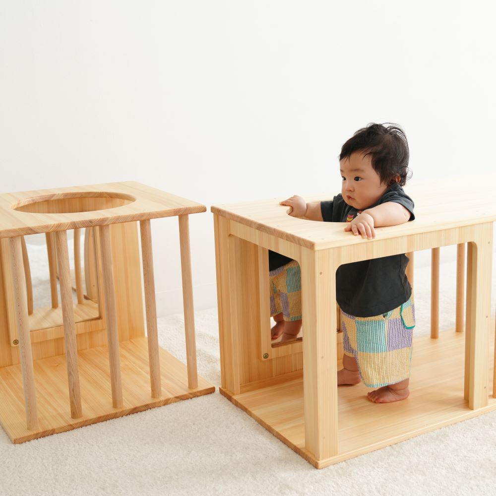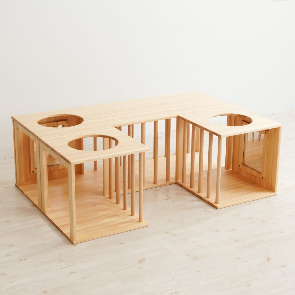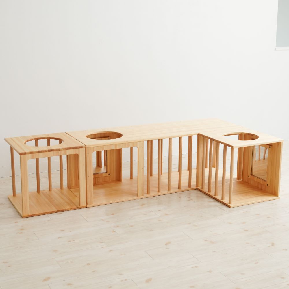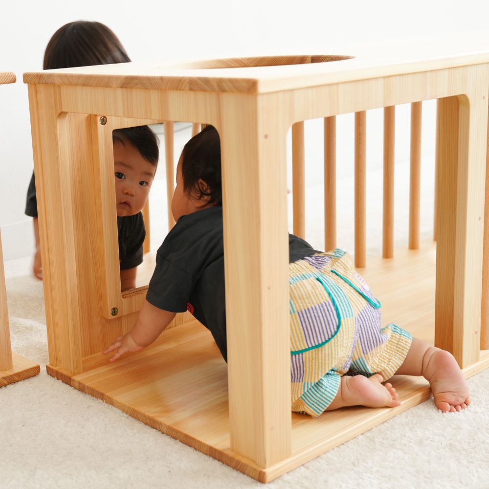 大サイズブロックは幅150cmあります。子どもたちはどの方向からも出入りすることができます。上の穴、サイドに設けられた開口部。重要なのは完全に仕切られている閉鎖的な空間ではなく、外部のお母さんの様子が確認できるということです。お母さんの目が届くことが子どもにもお母さんにも安心感を与えてくれます。