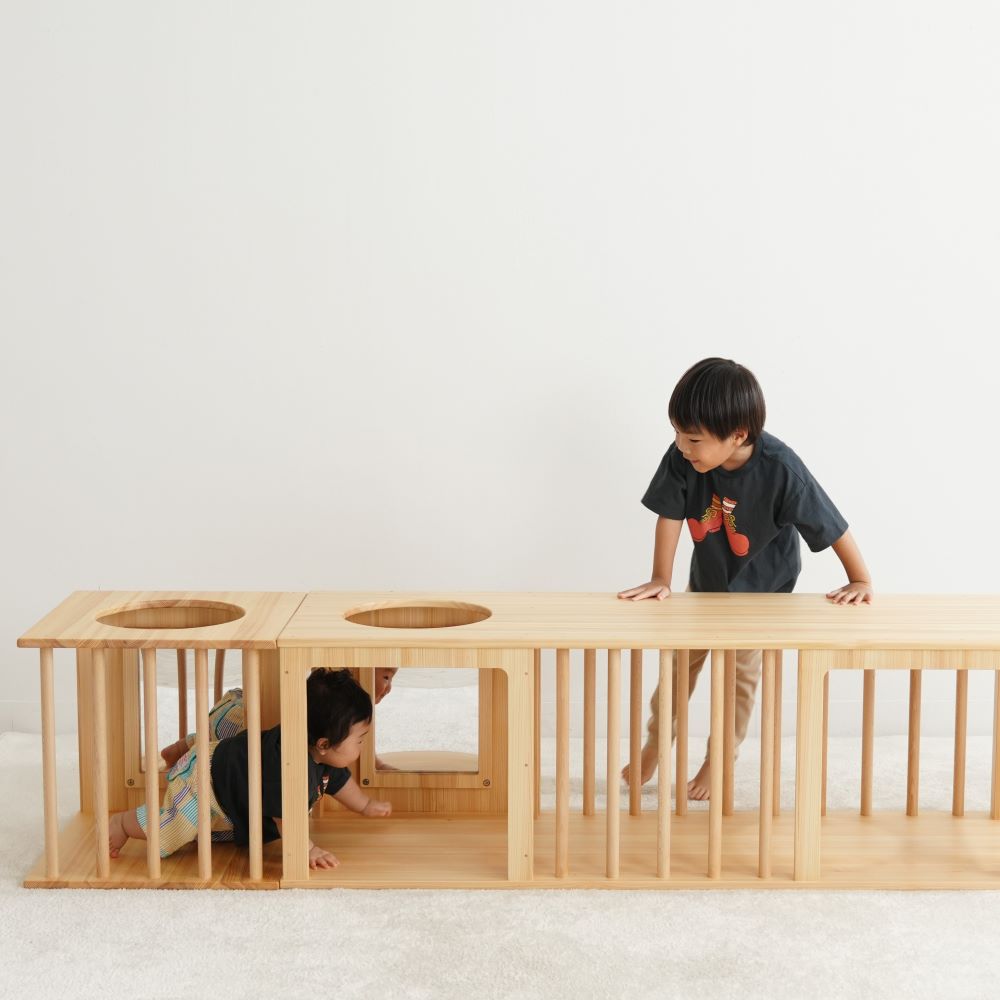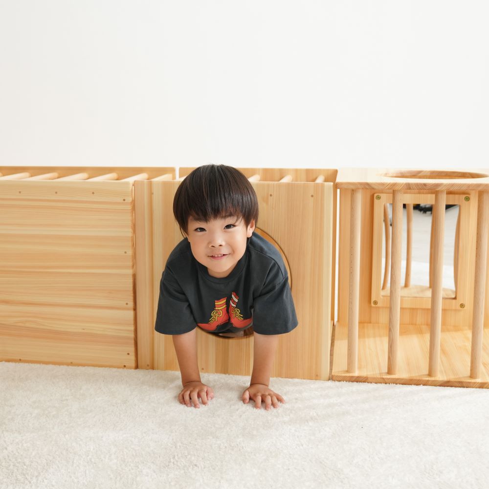 シンプルなデザインの中に、いろんな工夫を凝らしています。鏡がついていたり片面だけ丸くくりぬかれていたり、子どもたちの想像力を刺激して、いろんなパターンを遊びながら学んでいきます。ブロックの配置を子どもたちが自ら決めることで、工夫して遊ぶ力を身に付けます。トンネル遊具は子どもたちの運動機能の発達を促進する室内遊具です。ぜひご検討してみてください。