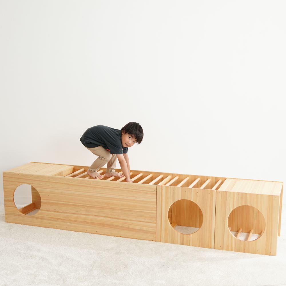 木の遊具専門店なかよしライブラリーが製作する【木製室内遊具トンネル遊び3点セット】です。室内で気軽に遊べる遊具として開発しました。 小規模保育園さんや一般のご家庭でも、外に出て遊べない雨の日など身体を動かしたいときに、 安全でかつ工夫をしながら遊べるトンネル遊具です。