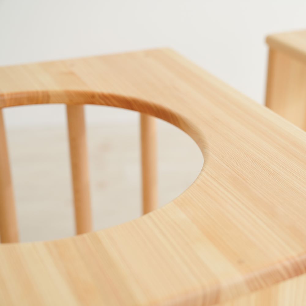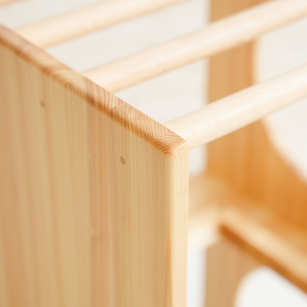 角はすべて丸く仕上げています。職人の手仕事で丁寧に作り上げることで、いつまでも子どもたちに安心して使っていただけます。
